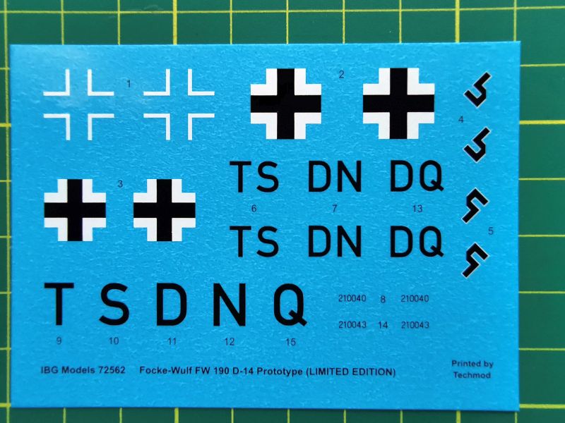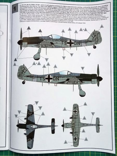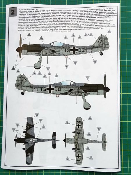 Na ich podatnie możemy wykonać miniatury dwóch prototypów FW-190D-14, czyli TS+DN oraz TS+DQ. Podkreślenia wymaga natomiast to, że jest to jedynie próba rekonstrukcji tych malowań, dokonana na podstawie zachowanych dokumentów. Nie są natomiast znane zdjęcia tych samolotów, o tym należy pamiętać przystępując do budowy. Schematy oczywiście na końcu instrukcji i tu na koniec mała uwaga. W instrukcję wkradł się chochli drukarski, bowiem zarówno schematy malowania, jak i część rysunków montażowych, ba także boxart sugeruje że prototypy samolotu FW-190D-14 były uzbrojone w dwie pary działek w skrzydłach, tak jak prototyp D-9. Tak jednak nie było. Prototypy D-14 nie powstały w wyniku przebudowy „Krótkich Fok”, ale były to zaadaptowane D-9, które miały tylko po jednej parze działek skrzydłowych. Dlatego nie szukajmy w pudełku żadnych dodatkowych elementów, nie reklamujmy zestawu u producenta i nie róbmy zadymy po Inetrnetach. To nic nie da.