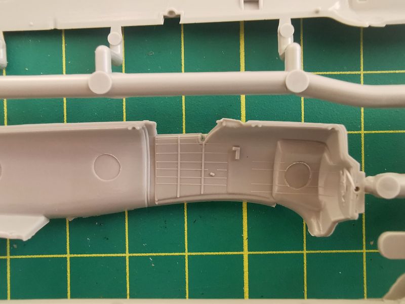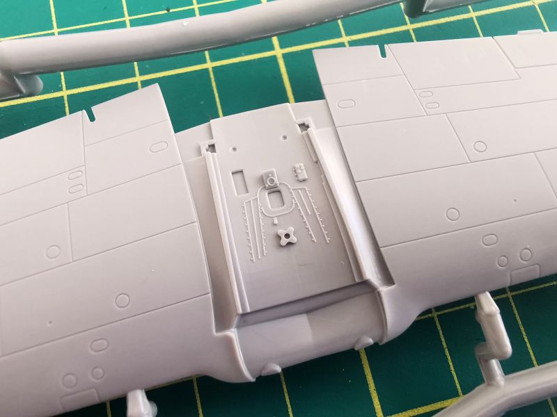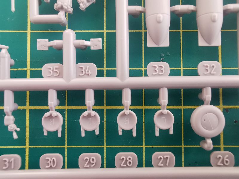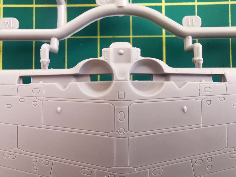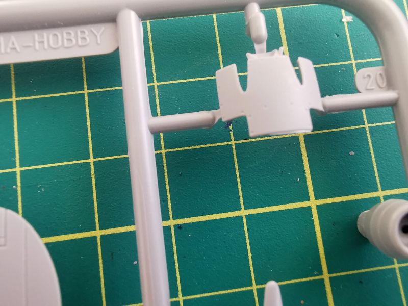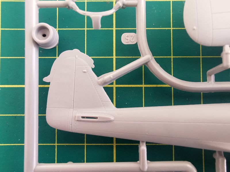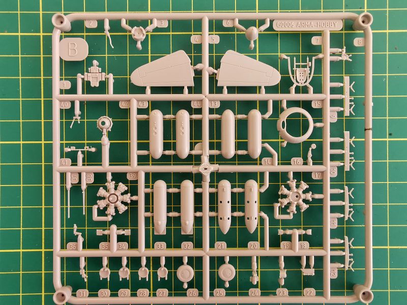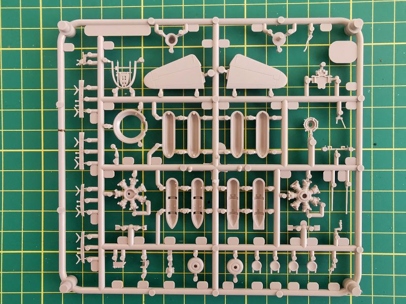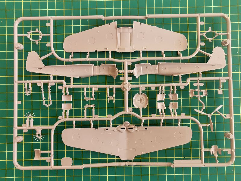 Podstawowe elementy modelu zostały rozmieszone na dwóch wypraskach z jasnoszarego tworzywa. Pierwsza z nich, większa to kadłub, płat oraz trochę drobnych elementów takich jak rury wydechowe, osłona silnika czy część detali podwozia.