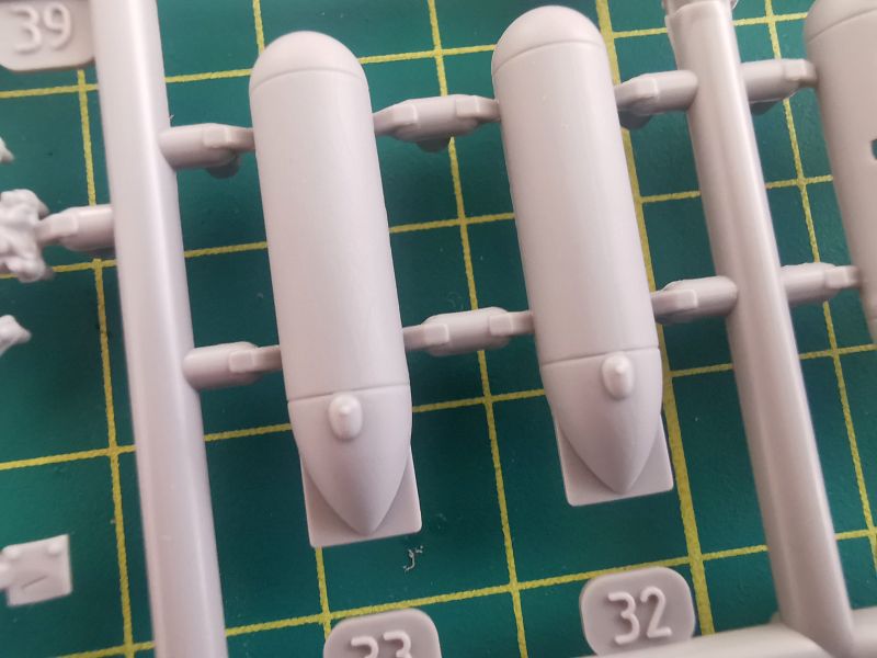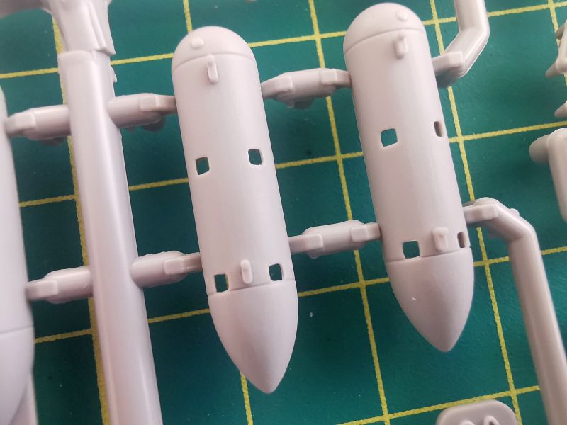Modelarze mają do dyspozycji dwa typy podwieszanych zbiorników z paliwem- wczesne i późne. Zaprojektowano je w ciekawy sposób. Wczesne montujemy bezpośrednio do płata, ale zanim skleimy je w całość , w środek musimy wkleić wręgi z uchwytami. Późne z kolei podwieszamy przy pomocy wyrzutników, których uchwyty musimy wygiąć o 90 stopni. Do dyspozycji mamy dwa typy takich wyrzutników, a jeżeli mamy z magazynku bomby (które mogły zostać po klejeniu modelu Hayate) można też ich użyć.