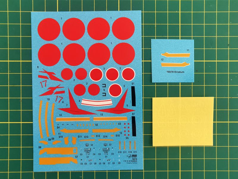 Kalkomanie do modeli Arma Hobby zazwyczaj drukuje dwóch podwykonawców. Nasz rodzimy Techmod i okazjonalnie włoski Cartograf. W przypadku tego zestawu, kalkomanie wykonał Techmod. Jest to średniej wielkości arkusz uzupełniony mniejszą erratą, na której znajdziemy poprawne oznaczenia do jednego z malowań. Poza typowymi elementami w postaci znaków, numerów i godeł mamy także dość sporo drobiazgów do umieszczenia w kabinie (do dyspozycji dwa komplety) oraz trochę napisów eksploatacyjnych. Jak się prezentują, widać na powyższych zdjęciach. Sam osobiście bardzo się cieszę, że w postaci kalkomanii są także elementy szybkiej identyfikacji w postaci żółtych pasów umieszczonych na wewnętrznych częściach krawędzi natarcia skrzydeł. Tego bardzo brakowało mi w Hayate. Kalkomanie uzupełniają maski do zabezpieczenia oszklenia oraz kół osłony kabiny. W modelach Arma Hobby o oczywiście standard.