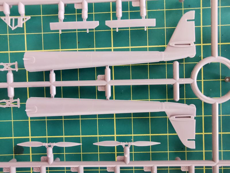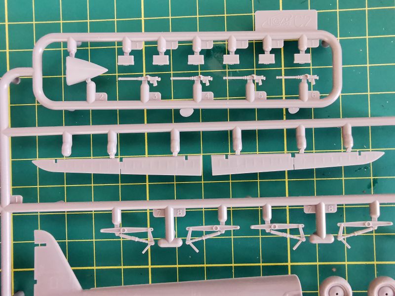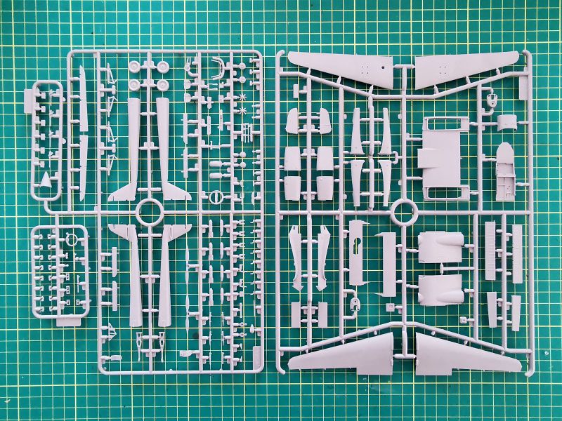 Są to wypraski widoczne na powyższym zdjęciu. Podstawowe elementy modelu rozmieszczono w sumie na czterech wypraskach. Dwie większe, „A” i „B” oraz dwie mniejsze „C1” i „C2”, widoczne po lewej, połączone z wypraską „B”. Wykorzystamy kadłuby, skrzydła, usterzenie podwozie i część detali, pominiemy centropłat i kabinę załogi wraz z wyposażeniem.