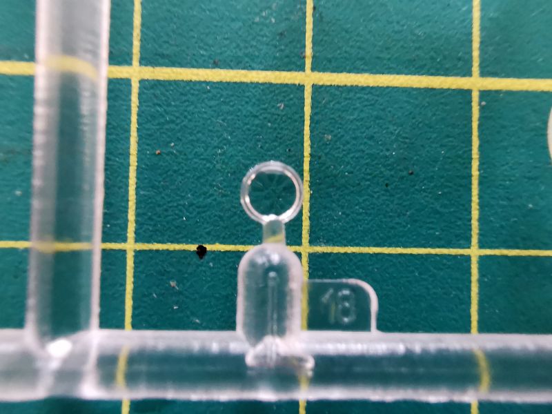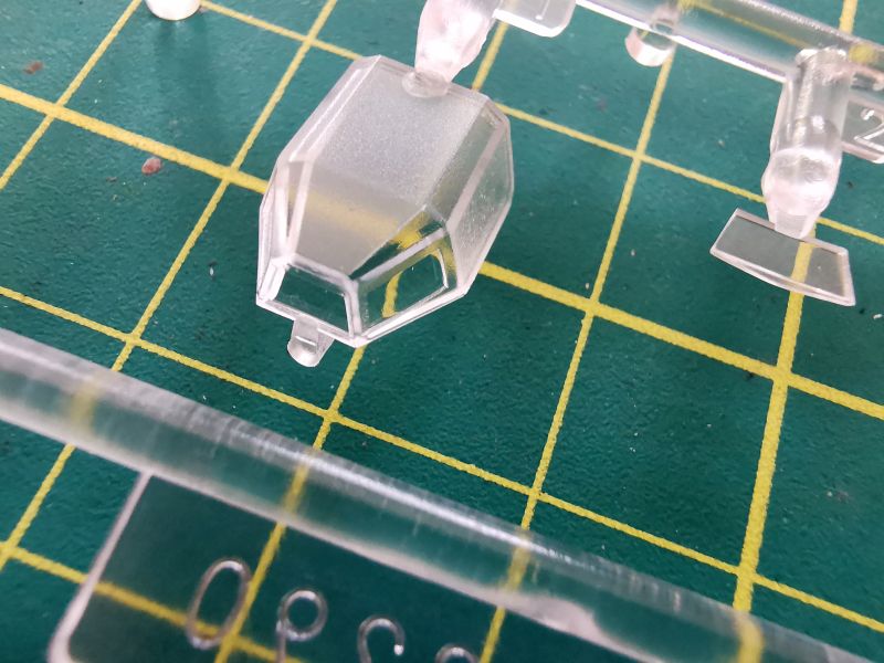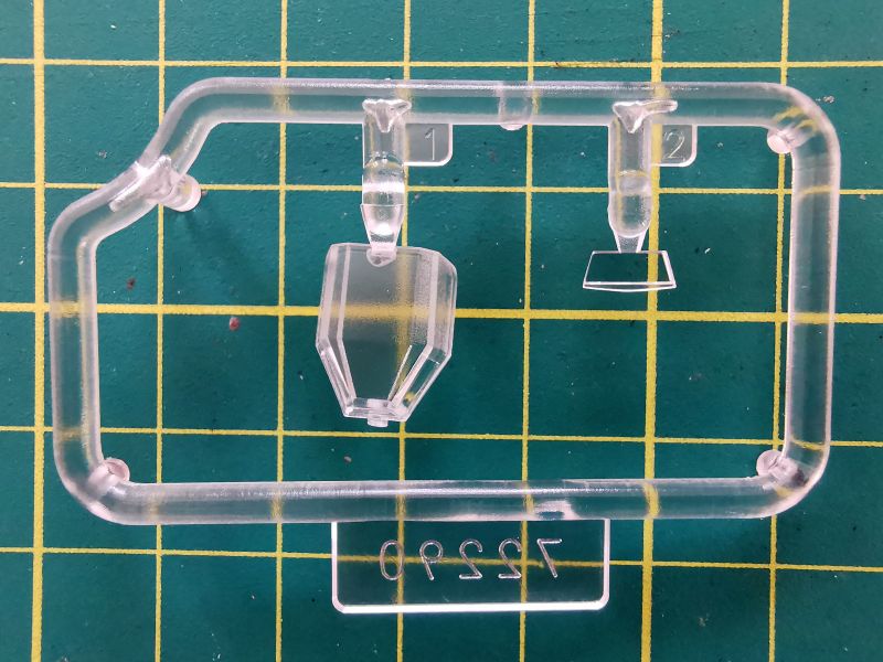 Oszklenie składa się z dwóch wyprasek. Pierwsza, większa to standardowa wypraska do wcześniejszych wersji, zaś wykorzystamy z niej jedynie okrągły element widoczny na zdjęciu po lewej z dołu. Wykorzystamy natomiast całą zawartość mniejszej wypraski, czyli składające się z dwóch elementów oszklenie „bunkra”. Doskonale widać, że niewiele będzie widać przez te małe okienka, pomimo dobrej przezroczystości elementów i ich dość cienkich ścianek.