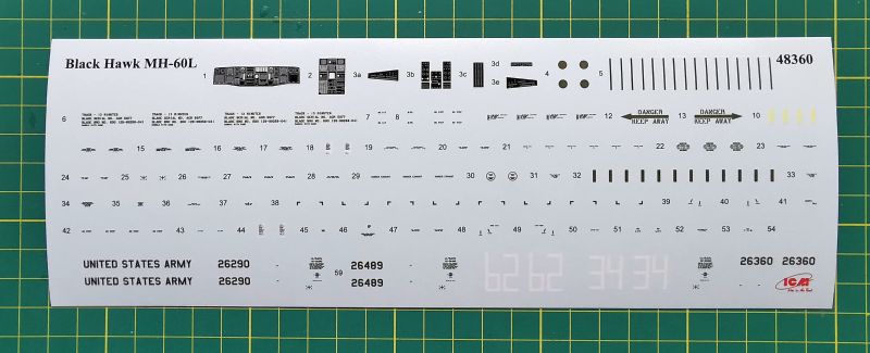 Kalkomanie znajdują się na dość sporym podłużnym arkuszu. Są to przede wszystkim napisy eksploatacyjne. Nie znajdziemy tu tak charakterystycznych dla amerykańskich statków powietrznych barwnych godeł czy emblematów. Jest to podyktowane specyfiką tej właśnie wersji śmigłowca. W przypadku dwóch wariantów malowania mamy jedynie białe numery do umieszczenia na burtach kadłuba. Dysponujemy za to pokaźną ilością kalkomanii do umieszczenia na tablicy przyrządów i na równego typu konsolach w kabinie.
