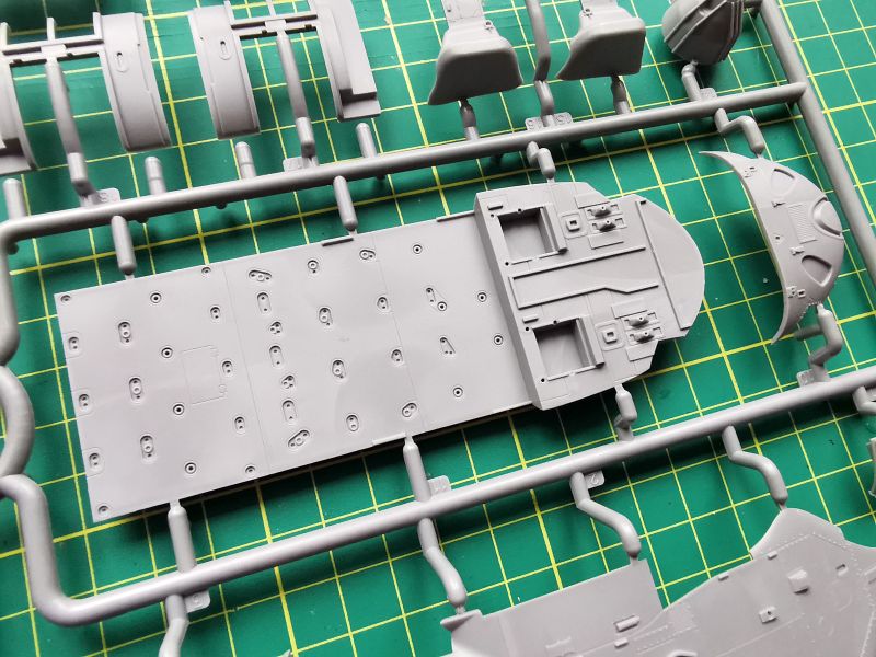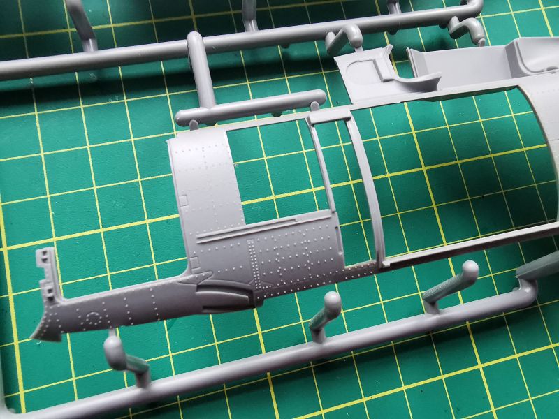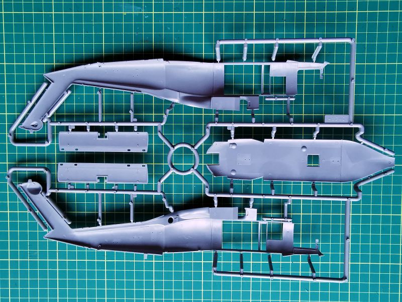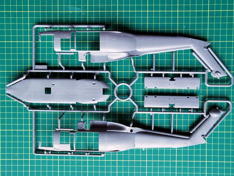 Model został opracowany w dość podobnej konwencji jak inne wcześniej wydane modele śmigłowców, takie jak Cobra czy CH-54A, niezależnie od podziałki. Producent w niemal misterny sposób wykonał fakturę powierzchni z delikatnymi, wgłębnymi liniami podziału oraz równie delikatnymi wypukłymi nitami. Tak właśnie wygląda kadłub, który wraz ze statecznikiem poziomym znajduje się na wyprasce oznaczonej jako „A”. Kadłub składa się z połówek prawej i lewej oraz podłogi. W nim zabudujemy kokpit, przedział desantu, zaś nad tym zamontujemy górę kadłuba wraz z wirnikiem. Na końcu zaś wspomnianą przeze mnie podłogę.