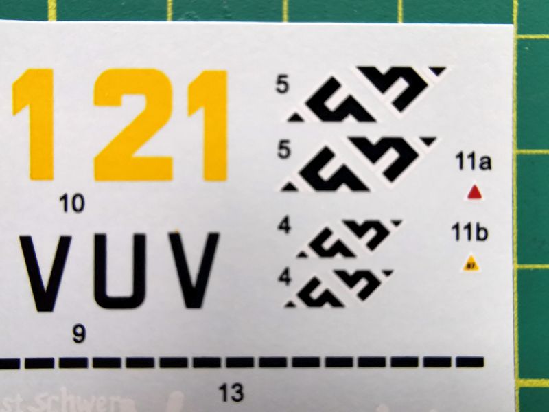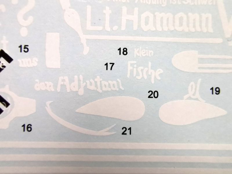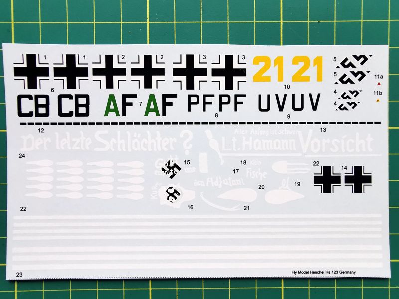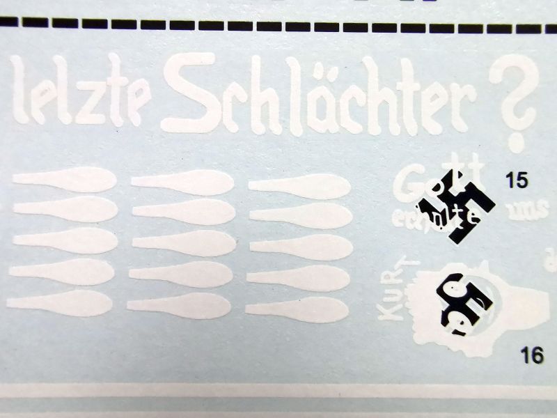 Kalkomania do tego zestawu została wydrukowana w Niemczech. To dość spory arkusz, ponieważ jedno z propozycji malowania zawiera szereg emblematów w kolorze białym w postaci napisów, pasów i różnych innych rzeczy, którymi pokryty jest praktycznie cały samolot. Uwagę zwracają oczywiście przecięte na pół dla poprawności politycznej swastyki, zaś wszystkie elementy kalkomanii wydrukowane zostały prawidłowo pod względem merytorycznym i technicznym.