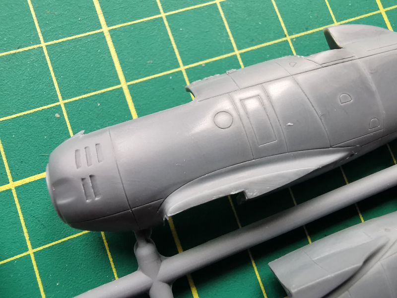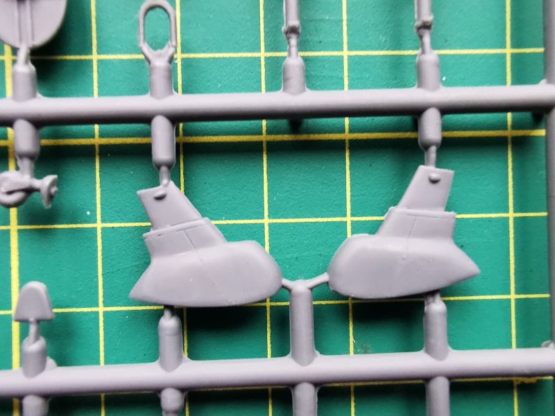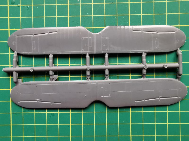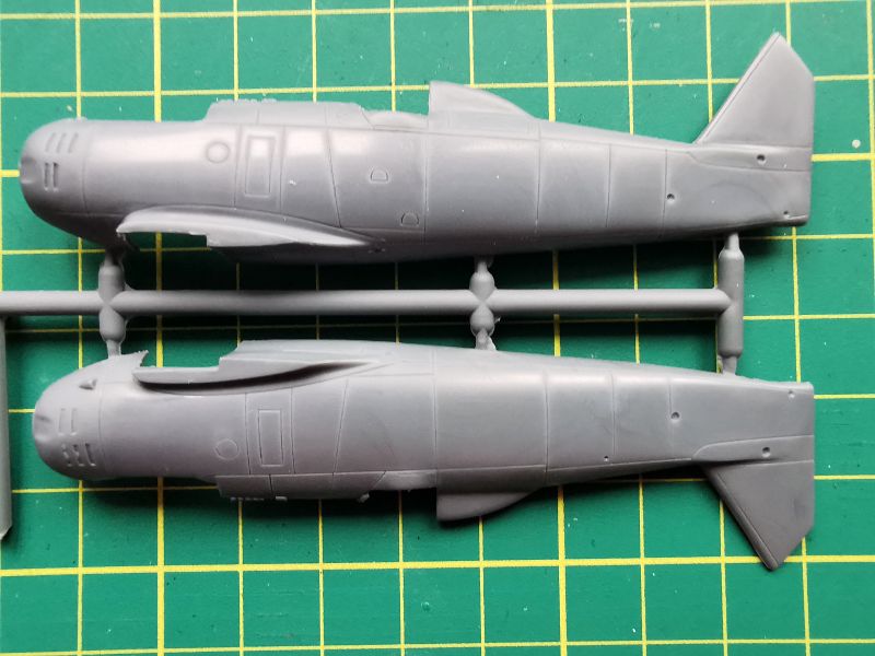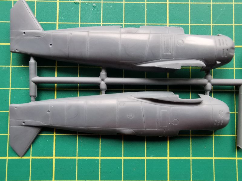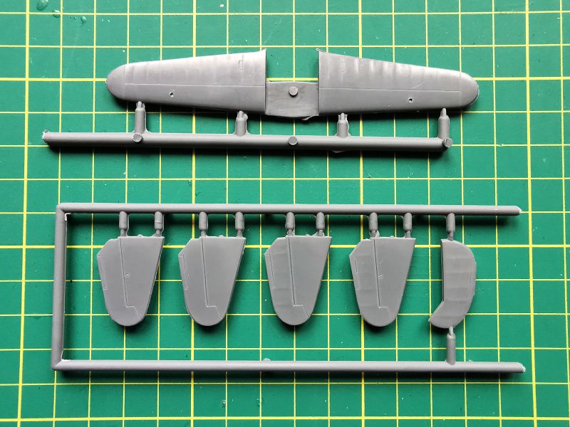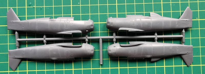 Zacznijmy jednak od form wtryskowych. Wykonane z szarego dość twardego tworzywa. Do dyspozycji mamy dwie wersje kadłuba, z garbem za kabiną lub bez. Nie zostały rozmieszczone na typowej wyprasce. Pierwsze wrażenie może nie być pozytywne, zwłaszcza jeśli obok położymy wypraskę od modelu wieloseryjnego, także wydanego w tym samym okresie.