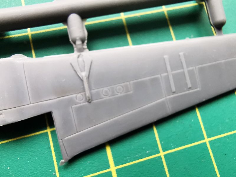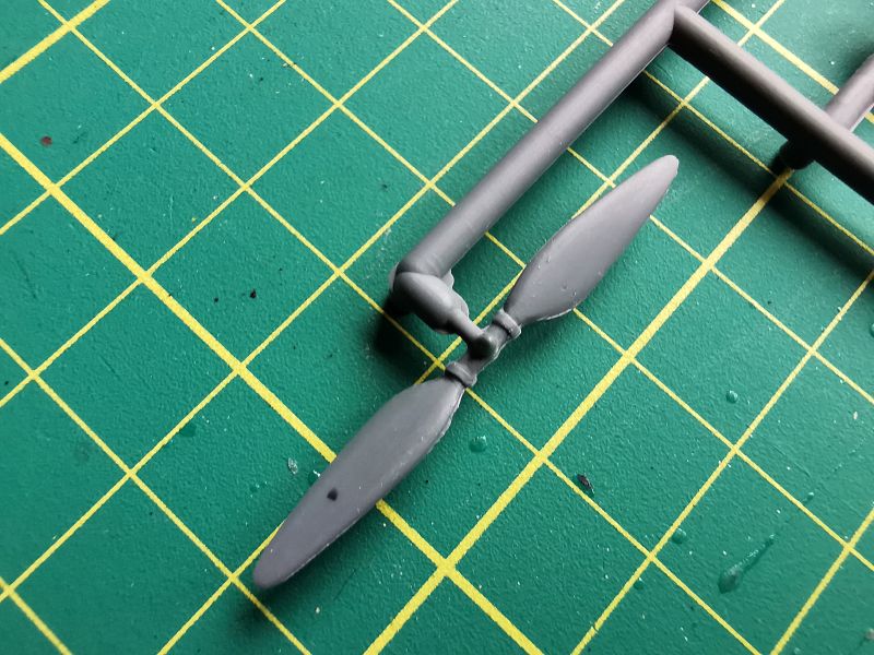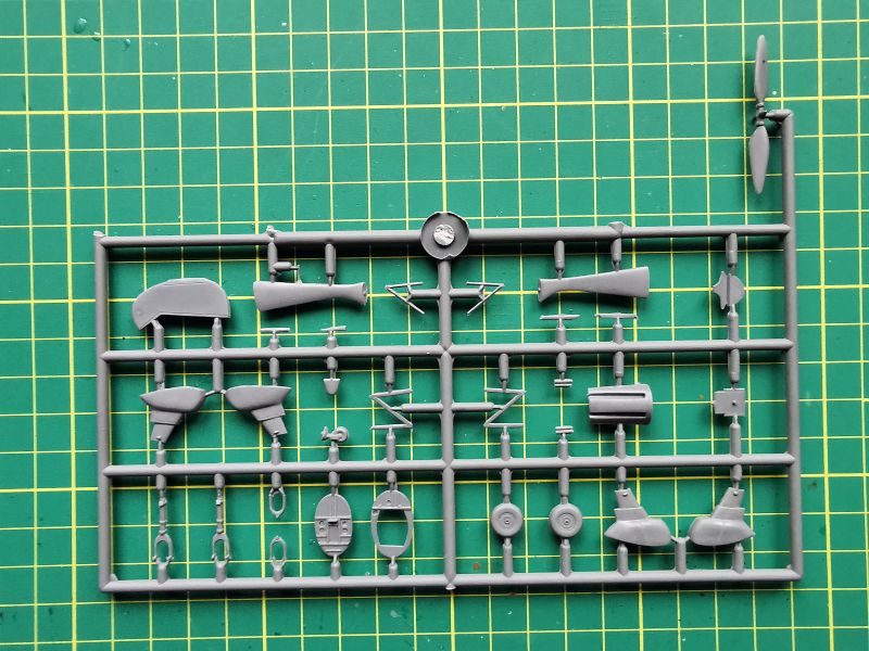 Jest też ramka wtryskowa w dzisiejszym rozumieniu tego słowa. Znajduje się na niej kilkanaście drobnych elementów wyposażenia kabiny, podwozia (także dwa warianty – osłonami lub bez) śmigło czy zastrzały. Jak widać na zdjęciu detale nieźle wykonane, ale wymagające dopieszczenia narzędziami skrawająco – ściernymi. Większość nadlewek lub śladów przesunięcia połówek formy wtryskowej jest na szczęście łatwa do usunięcia i nie będzie wymagać jakiegoś szczególnego nakładu pracy. Podejrzewam, że znacznie więcej pracy zajmie nam osadzenie sklejonego kadłuba na dolnym płacie. W wielu modelach tego typu miejsce to wymagało użycia szpachlówki, a potem obróbki tych miejsc. Jak zaznaczyłem powyżej jest norma w tych modelach i biorąc taki właśnie model na warsztat trzeba być na to gotowym.