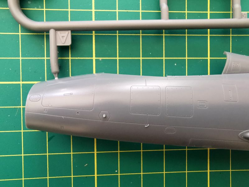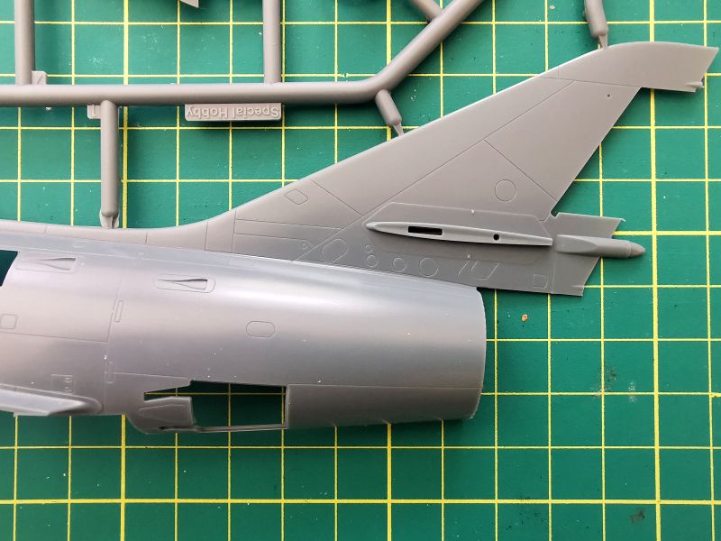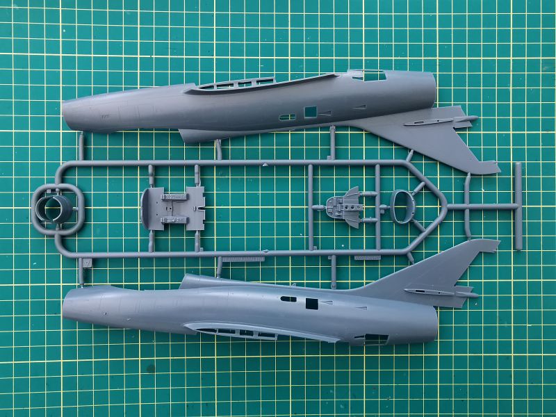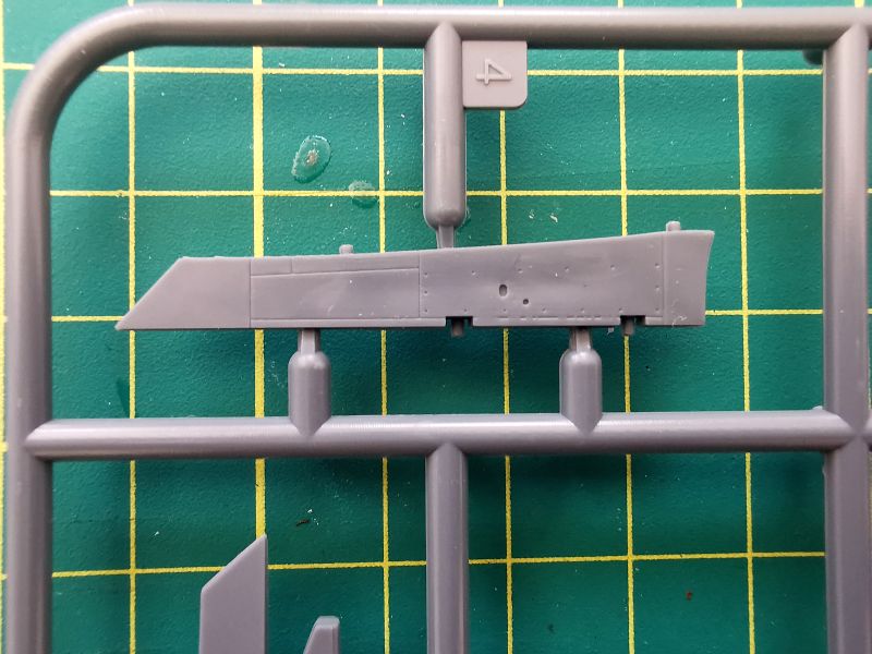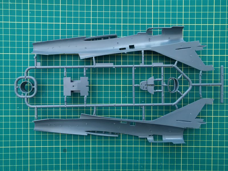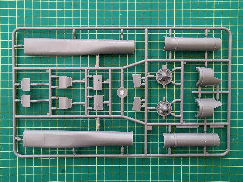 Z takiego właśnie tworzywa wykonana została ramka „A” na której znajdują się połówki kadłuba, wlot powietrza, dysza oraz dwa podstawowe podzespoły kokpitu. Od razu widać także to, że jest to jeden z nowych produktów Special Hobby a nie wznowienie modelu od pewnego czasu będącego na rynku. Nie zaobserwowałem żadnych wad produkcyjnych w postaci deformacji wyprasek, jamek skurczowych i temu podobnych rzeczy. Ślady po wypychaczach owszem są, ale nie znajdują się w niewidocznych miejscach. Gdzie nie gdzie mogą pojawić się drobne, proste do usunięcia nadlewki. Faktura powierzchni kadłuba wyraźnie wskazuje na cyfrowe projektowanie modelu. Linie podziału oczywiście wgłębne. Jednocześnie delikatne i równe a jednocześnie wyraźne. Imitacje szwów nitowych wykonano tylko w niektórych miejscach. Jeżeli komuś to nie wystarcza, musi poradzić sobie sam.