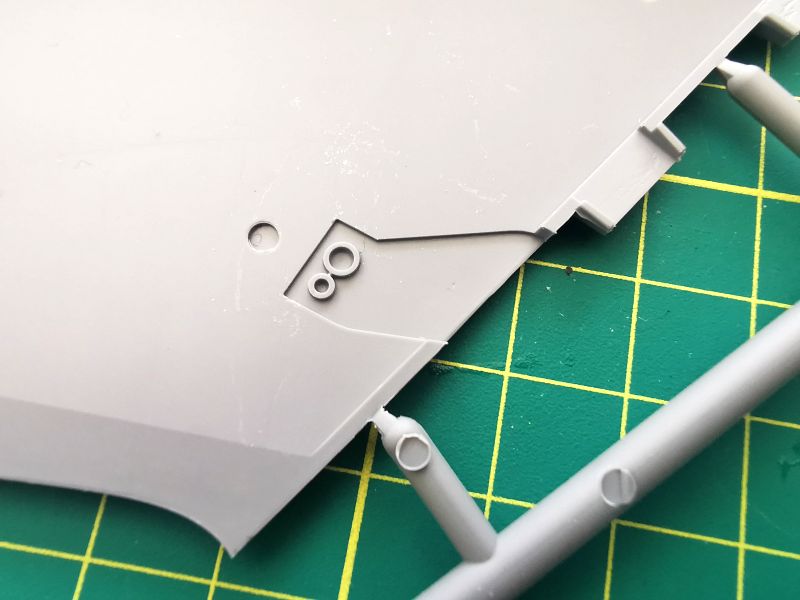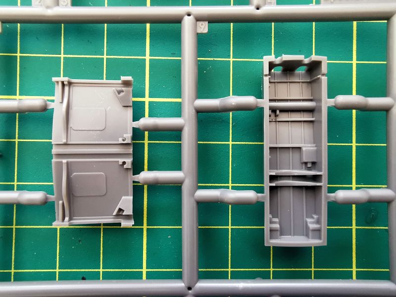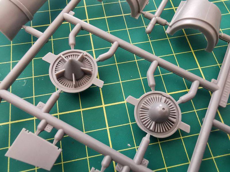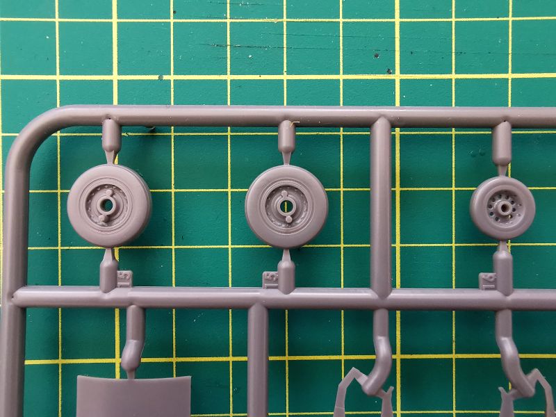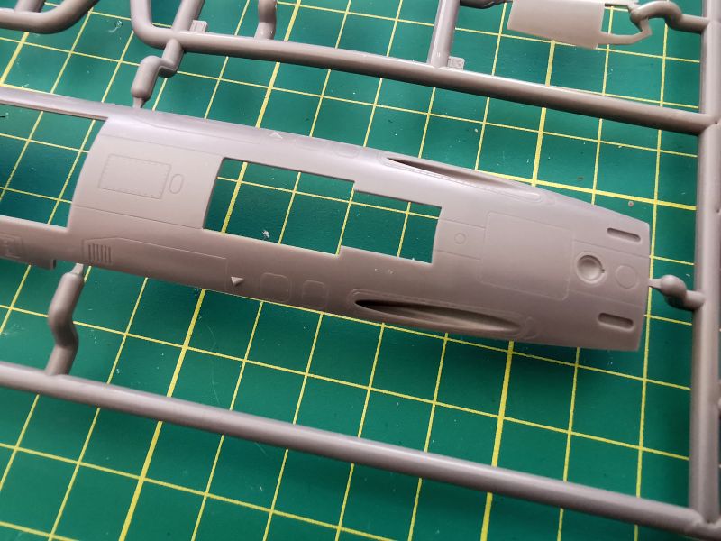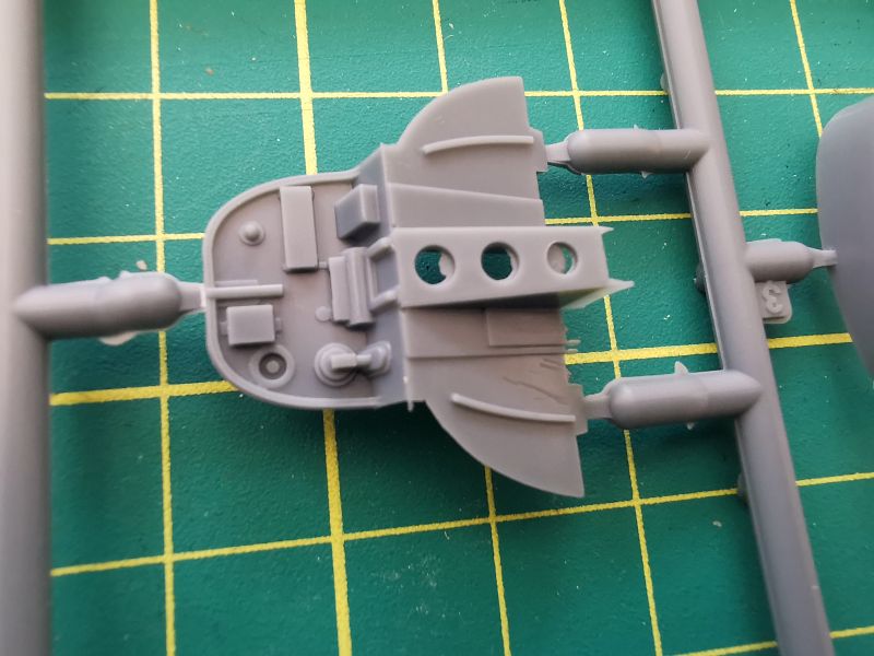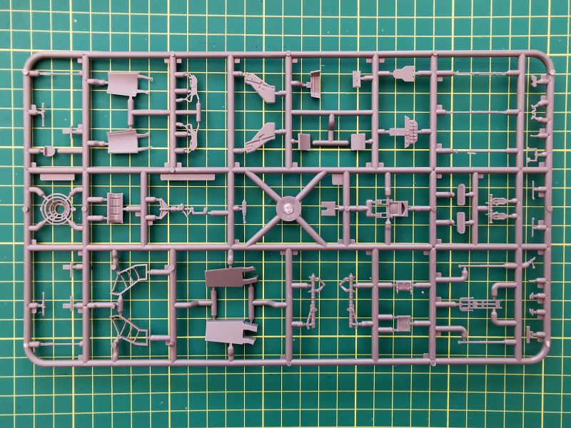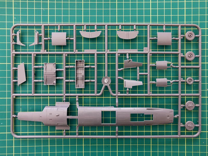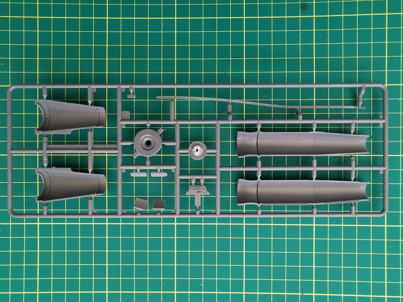 Kadłub ma klasyczny podział na prawą i lewą połówkę. No prawie klasyczny, bo dolna jego część stanowi osobny element. Do niego zamontujemy wnęki podwozia głównego i przedniego i połączymy z resztą kadłuba. Te elementy znajdują się na ramce „D”. Są też tam koła, pokrywy hamulców aerodynamicznych i detale fotela, ale w naszym przypadku ich nie wykorzystamy pomimo, że prezentują się naprawdę ładnie.