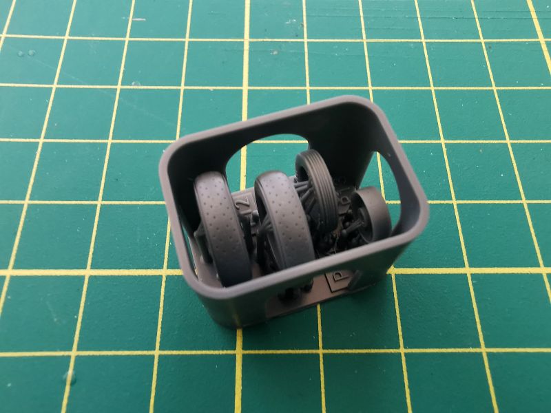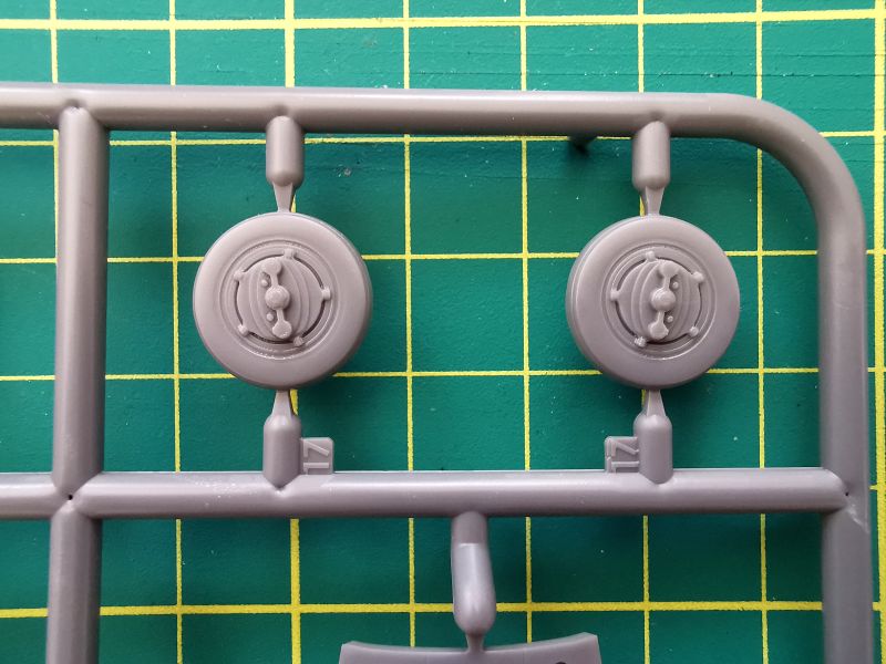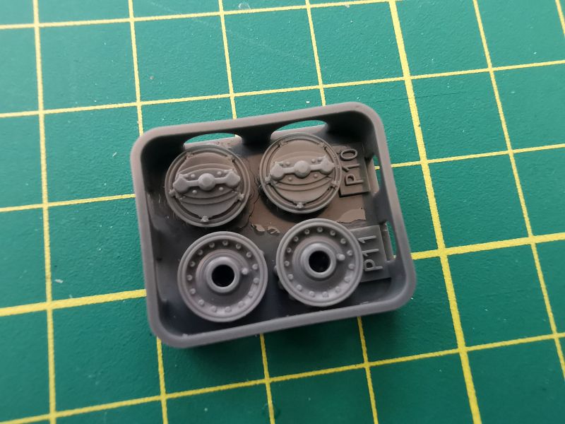 Koła. Składają się z osobnych felg oraz opon. Ten patent znany z wyrobów CMK doskonale się sprawdza podczas malowania. Tu mamy bieżniki i ugięcia na oponach. Są także napisy na bokach opon. Felgi mają bardzo wyraźny detal. Jako elementy przezroczyste wykonano natomiast końcówki głowic optoelektronicznych w pociskach rakietowych.