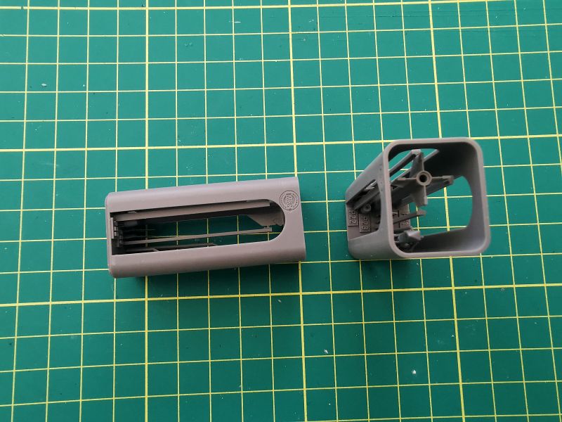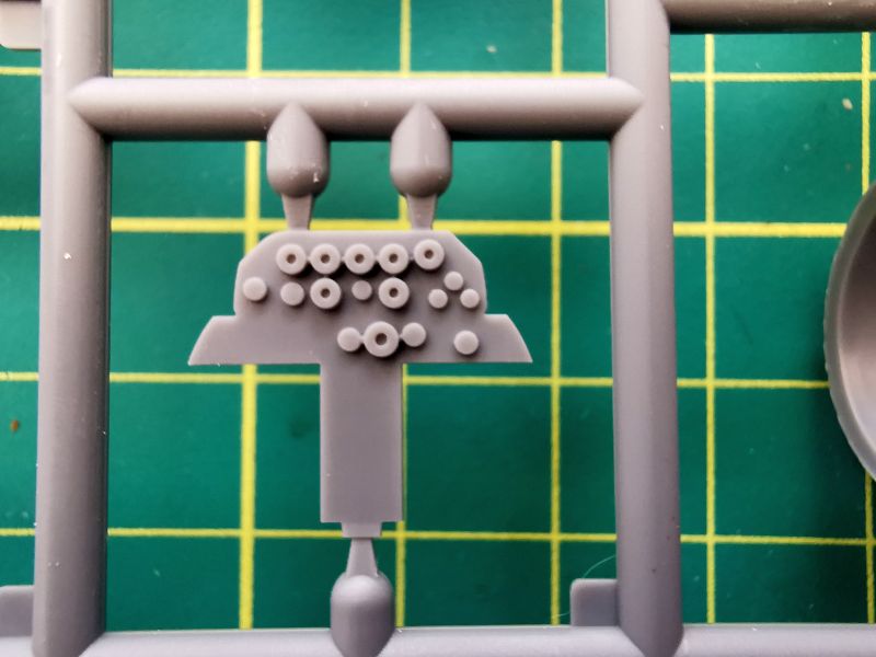 Ramka „F” to jedna z tych ramek, których nie było w tym modelu w wydaniu Azur Frrom. Zawiera tylną część kadłuba, odpowiednią dyszę silnika, tablicę przyrządów oraz kilka innych elementów, które na pewno się nam przydadzą, w instrukcji żaden nie został przekreślony na czerwono. Tablica przyrządów także przykuła moja uwagę ładnie wykonaną fakturą. Swoją drogą jestem ciekaw jak będzie się na niej kłaść kalkomania wykonana nową metodą firmy Eduard. Co ciekawe zaznaczono na niej puszki zegarów i z tego, co zdążyłem się zorientować, będą one widoczne z przodu. Trzeba będzie dołożyć trochę przewodów.