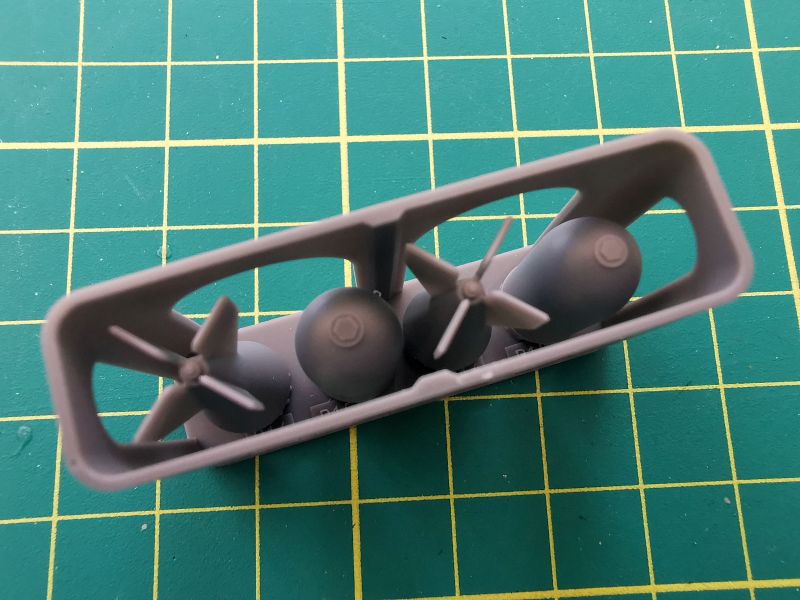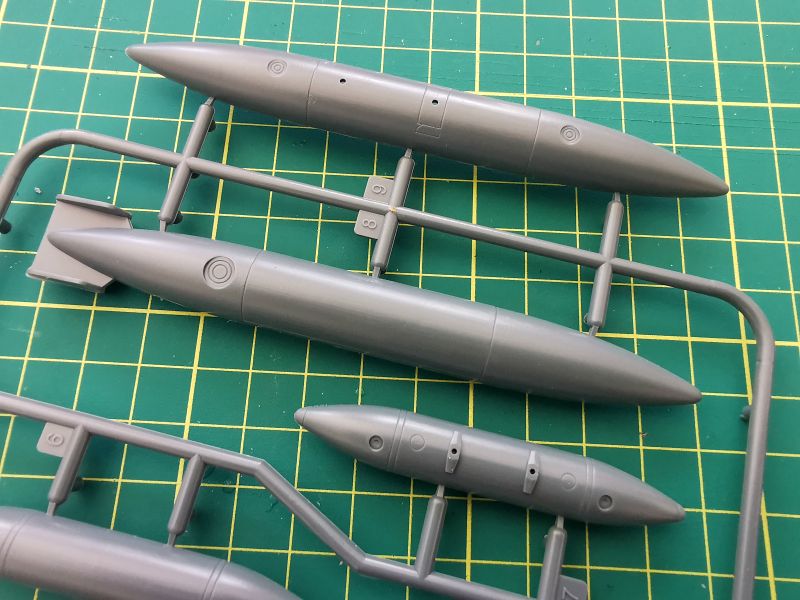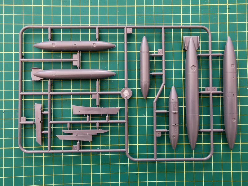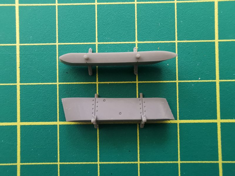 Same bomby 250 kg znajdują się na kolejnym wydruku, a każda z bomb składa się z dwóch elementów. Wszystkie szczegóły konstrukcji bomb wykonane są jak należy. Jest też alternatywa, w postaci zestawu CMK zawierającego belki wielozamkowe z bombami 100 kg. (CMK 4476)
