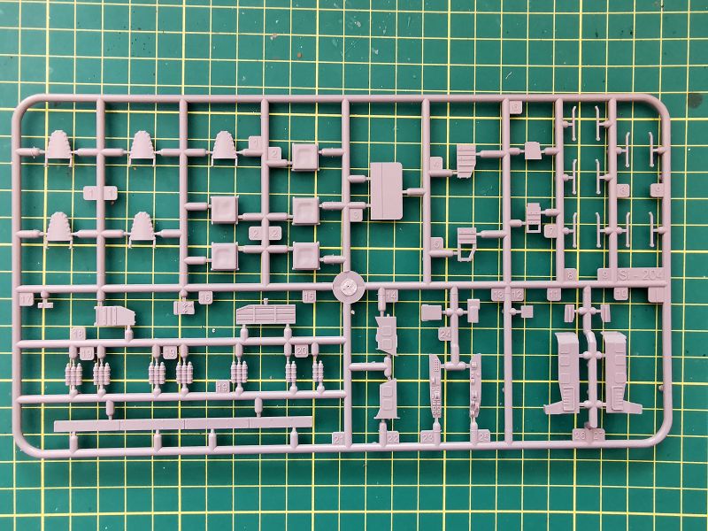Kolejna z ramek, która wpadła mi w ręce posiada oznaczenie „I”. Znajdują się tam detale wnętrza. Lubię modele samolotów wielosilnikowych, bo tam się zawsze dużo dzieje we wnętrzu kadłuba, lukach podwozia i tego typu miejscach. Omawiany model w punkt trafił w moje upodobania, bo kadłub ma kompletne wnętrze od nosa po usterzenie, a ta ramka jest tego przykładem. Zaproponowane przez Special Hobby wnętrze nie będzie wymagało jakiejś specjalnej waloryzacji. Wystarczy dorobić kilka dźwigni czy przewodów, żeby prezentowało się znakomicie.