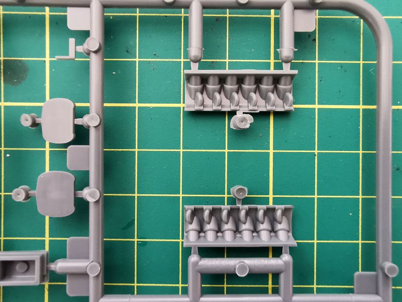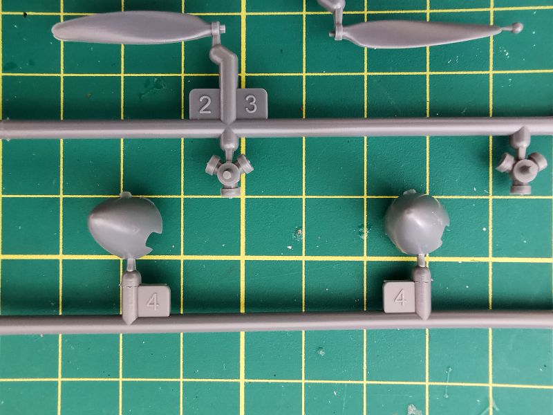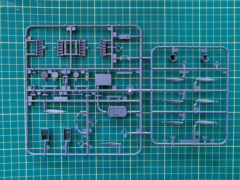 Dwie kolejne ramki wykonano z tworzywa o nieco innym odcieniu niż reszta. Pierwsza, większa oznaczona jako „F” zawiera cały szereg drobnych detali podwozia silników oraz drzwi wejściowe. Aż żal ich nie wykorzystać. Ramka „G” to elementy śmigieł dla odmiany francuskiej.