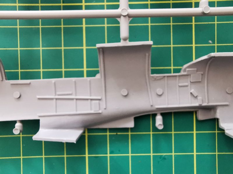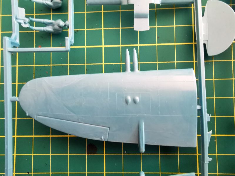 W podobny sposób powstała kolejna ramka, na której znajdują się większość podzespołów kadłuba. Ma on także klasyczny podział na prawą i lewą połówkę. Znajdziemy tam także trochę detali wnętrza kabiny, wlotu powietrza do chłodnicy i temu podobnych rzeczy. Zewnętrzna faktura kadłuba prezentuje się podobnie jak skrzydła. Wklęsłe, równe i wyraźne linie podziału blach, nie przekombinowane w żadną stronę powierzchnie kryte płótnem. Dopiero, gdy zajrzymy do wewnątrz, od razu przypominamy sobie z jaką technologią mamy do czynienia. Dość chropowata powierzchnia, sporo śladów po wypychaczach, na szczęście usunąć należy jedynie te z kabiny pilota, ale bezwzględnie trzeba to zrobić. Na burtach zaznaczono jedynie imitację konstrukcji kadłuba.