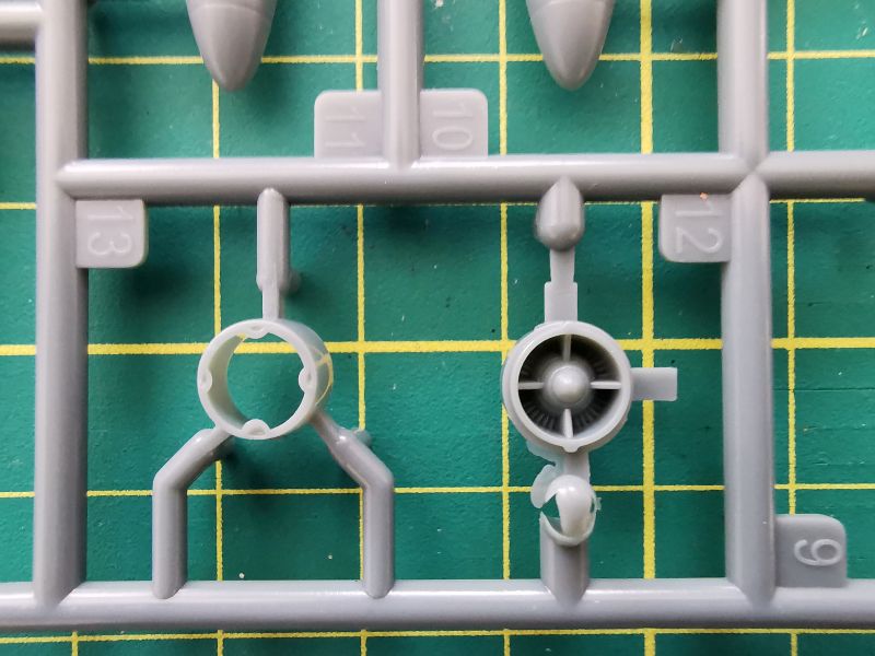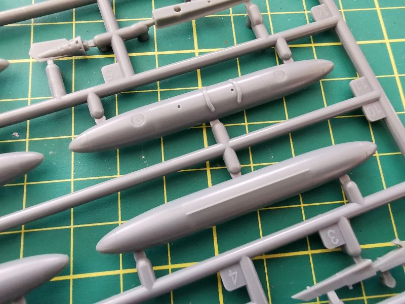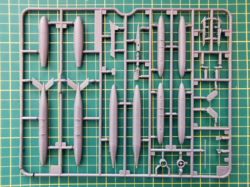 Z kolejnej ramki wykorzystamy także niewiele, bo jeden odrzucany zbiornik paliwa oraz kilka drobiazgów. Zawartość tej ramki to głownie podwieszane zbiorniki paliwa. Tu jednak mała uwaga, odpowiednio bogata dokumentacja powinna dać pole do wykorzystania większej ilości detali na tej ramce, podobnie ma się rzecz z niekierowanymi pociskami rakietowymi, o których wspominałem poprzednio.
