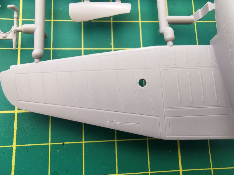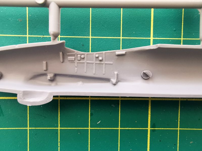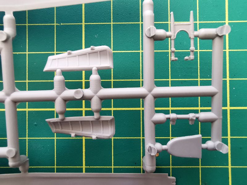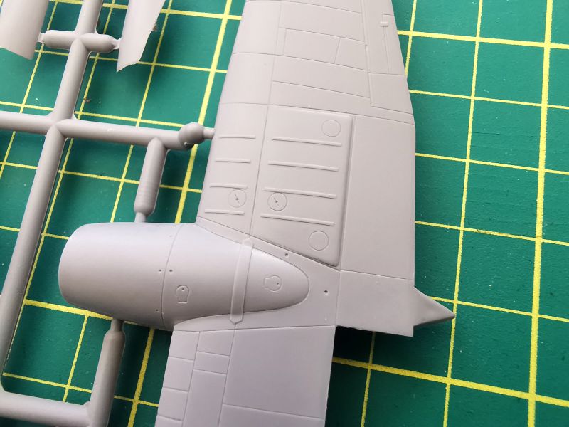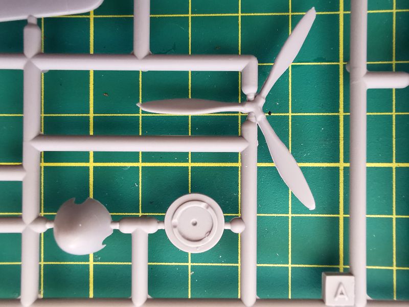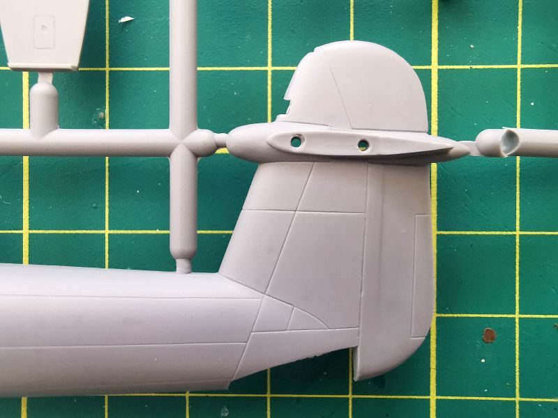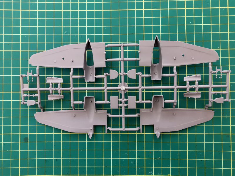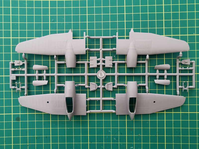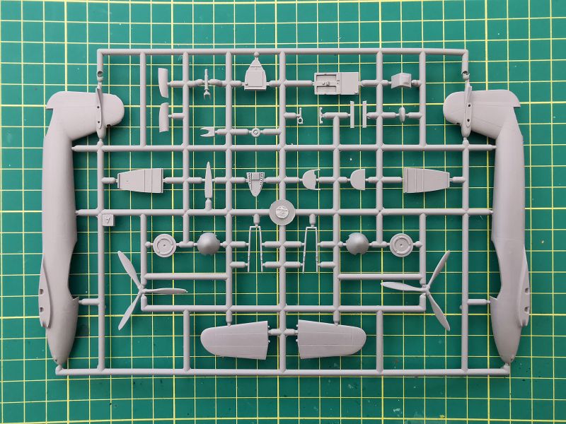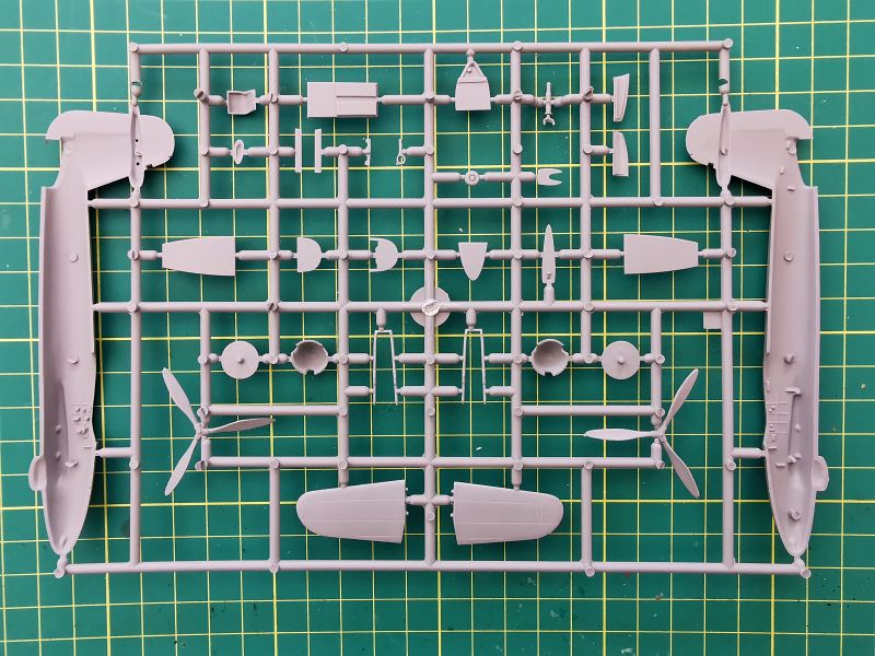 Podstawowe elementy modelu rozmieszczone zostały na dwóch wypraskach z jasnoszarego polistyrenu. Jak wspominałem, nie jest to model projektowany cyfrowo lecz klasycznie, lecz nie można powiedzieć, że traci przez to na jakości. Nie miałem w ręku poprzednich edycji tego zestawu, ale podejrzewam, że formy zostały zregenerowane o czym świadczy gładka powierzchnia powierzchni zewnętrznych kadłuba czy usterzenia poziomego, które znalazły się właśnie na tej wyprasce. Ponadto znajdują się detale kokpitu podwozia i śmigieł. Kokpit jest potraktowany bardzo szczegółowo, o czym świadczy dość duża liczba drobnych elementów znajdujących się na tej ramce, a także sporo wyposażenia znajdującego się na wewnętrznych ściankach kokpitu.