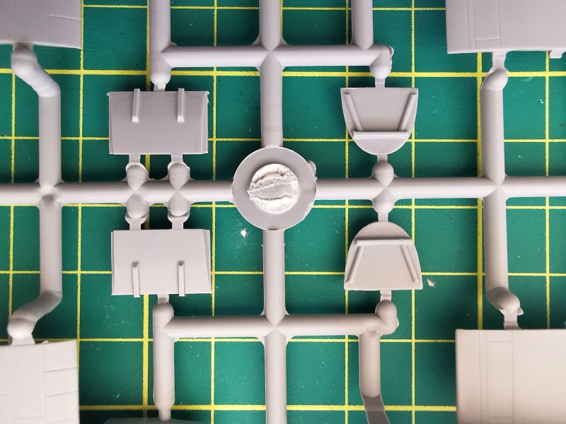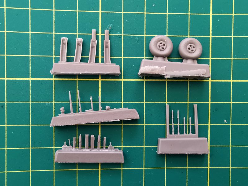 Ta klasyką są także odlewy żywiczne. Cała torebka, w sumie pięć wlewek z szarej żywicy. Mamy tu koła, osłony rur wydechowych, lufy działek i dość sporo różnych drobnych detali. Użyjemy je w różnych miejscach modelu.