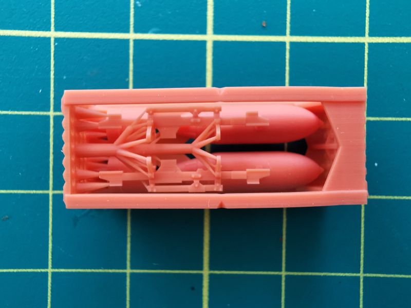 Nowoczesność to z kolei wydruk 3D, wykonany z pomarańczowej żywicy. Znajdziemy tam pięknie detalowane bomby wraz z wyrzutnikami. To jest właśnie to „Upgrade Edition 2024”. Wcześniej jak pamiętamy dostępne były tylko wersje myśliwskie, zaś tu mamy ostanie, bojowe wcielenie Whirlwinda, czyli odmianę myśliwsko – bombową, która z wieloma sukcesami zwalczała niemiecką żeglugę na Kanale La Manche.