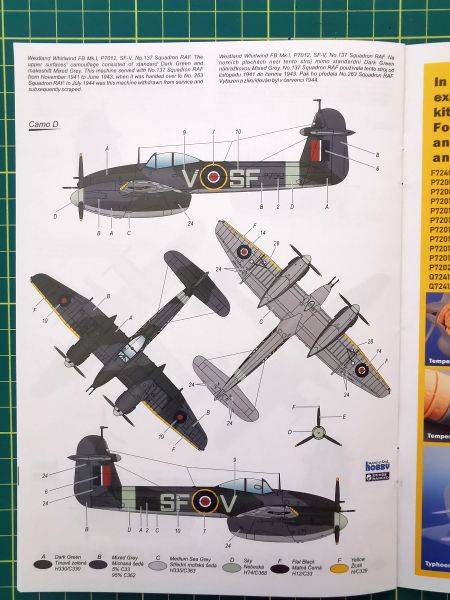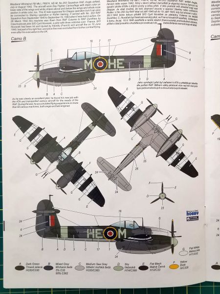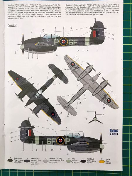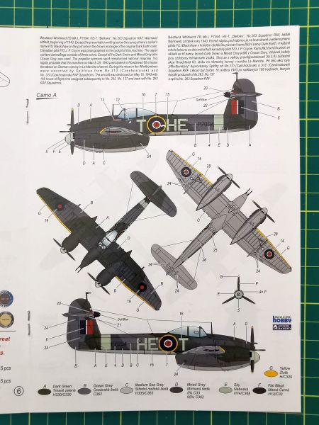 Producent proponuje nam cztery opcje malowania, po dwa z każdego z dywizjonów RAF latających na tym typie samolotu. Co ciekawe, aż dwa malowania mają związki z pilotami czeskimi. Podczas jednej z operacji 263 Dywizjon RAF był eskortowany przez 310 i 313 Czechosłowackie Dywizjony RAF. To wariant pierwszy, zresztą ta sytuacja jest przedstawiona na boxarcie na pudełku. Jeżeli wybierzemy wariant B, moim zdaniem najciekawszy, będziemy mieli model samolotu na którym został zestrzelony czechosłowacki pilot S/O Cyril Novacek. Takie ciekawostki, ale poznam się, że takie smaczki bardzo lubię.