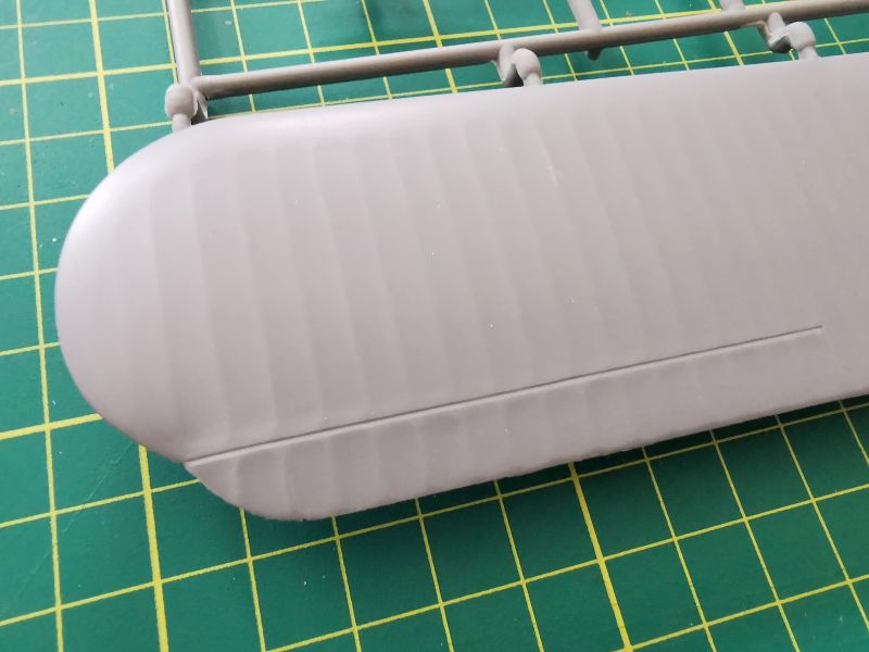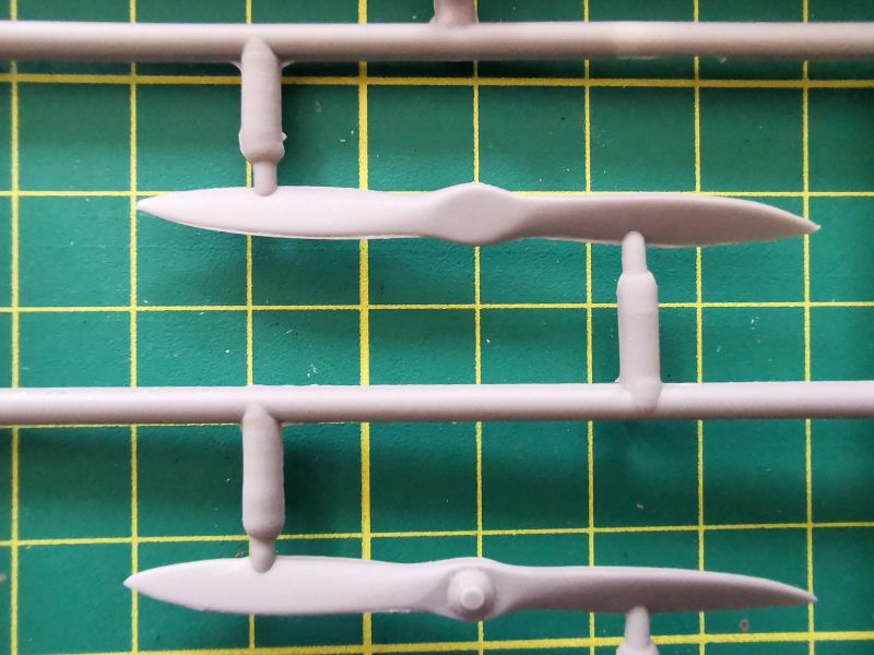 Dwie kolejne wypraski to płaty, usterzenie jeszcze trochę zastrzałów oraz śmigła. Płaty mają klasyczny podział, powierzchnie sterowe nie są wykonane oddzielnie, zaś opłótnienie jest wykonane w identyczny sposób, jak na kadłubie. Śmigłom i zastrzałom (wszystkim zresztą) przyda się zawarcie nieco bliższej znajomości z gąbkami ściernymi.