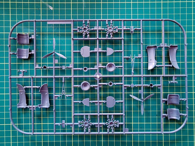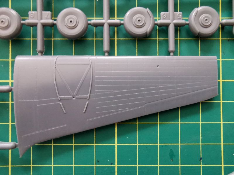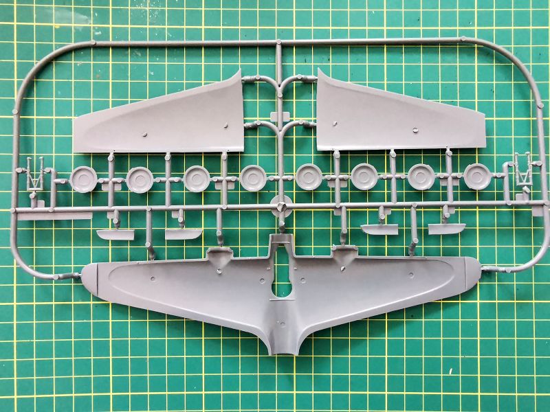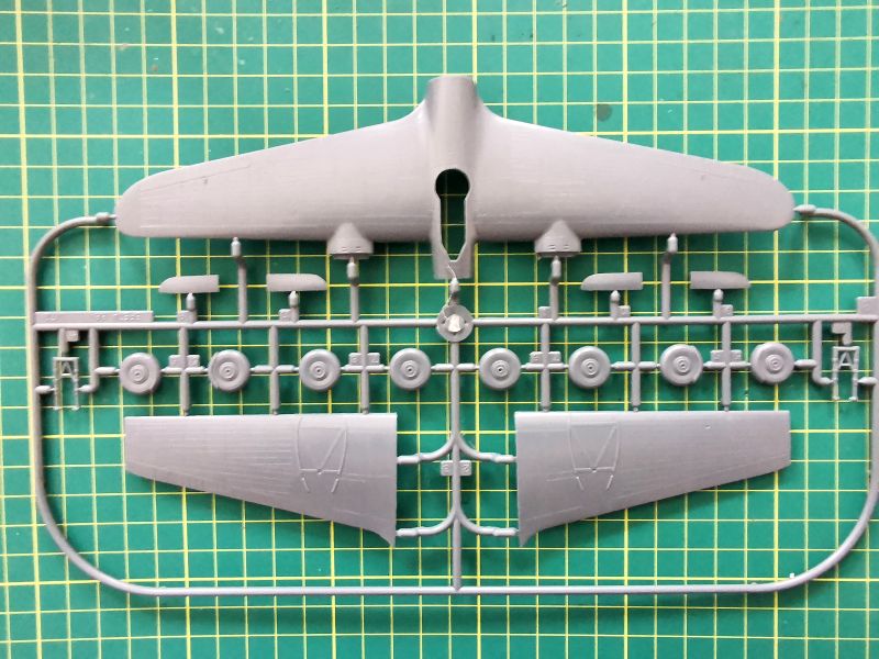 Kolejna, trzecia ramka to skrzydła, koła i pokrywy luków komór podwozia głównego. Są tam także golenie podwozia. Osobiście do gustu przypadła mi faktura powierzchni skrzydeł, przy czym same skrzydła a właściwie ich górna część, jako że samolot miał układ górnopłata, stanowi jeden element z przednią częścią kadłuba. Linie podziału wykonane w podobny sposób jak na kadłubie, dochodzą do tego gdzie niegdzie nity. Też mi się to podoba. Dysponujemy dwoma rodzajami kół podwozia głównego – z błotnikami i bez . W przypadku wyboru tych pierwszych czeka nas więcej gimnastyki przy malowaniu. Także warto rozważyć popracowanie nad pokrywami luków podwozia i goleniami. Ta ostatnia uwaga to tylko teoretyzowanie, bo sam osobiście nie znam za bardzo tego samolotu i szczegółów jego konstrukcji. Potrzebna będzie stosowna dokumentacja.