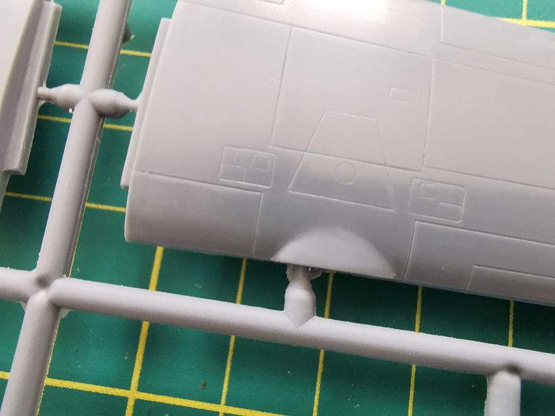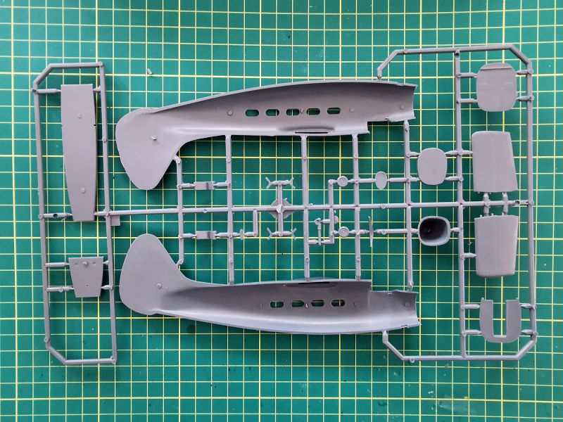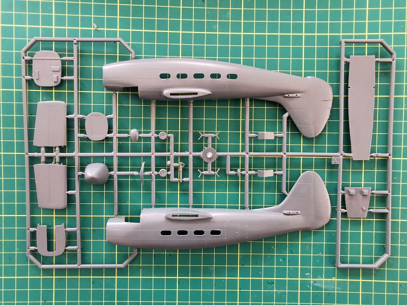 Podstawę zestawu stanowią cztery wypraski z jasnoszarego tworzywa. Dość twardego, znanego z wcześniejszych modeli czeskiego producenta. Na pierwszej z nich znajdziemy kadłub wraz z większością detali wnętrza (zabudować możemy zarówno kokpit jak i kabinę pasażerską) oraz usterzenie poziome. Wszystkie powierzchnie sterowe wykonano jako integralne elementy skrzydeł i usterzenia. Jeśli chcemy mieć na przykład klapy w pozycji wychylonej, konieczna jest praca samodzielna, lecz w przypadku tego modelu, jest niewielka różnica, ponieważ większość elementów musimy oczyścić z drobnych nadlewek i wyrównać krawędzie oraz miejsca styku połówek form. Połówki kadłuba są pozbawione kołków ustalających, zaś linie podziału, mimo, że wykonane ręcznie, prezentują się całkiem nieźle. Są równe i wyraźne.