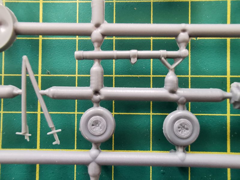 Druga wypraska to skrzydła i gondole silników. Jeśli chodzi o sposób wykonania linii podziału, to nie mam uwag, są wykonane tak samo, jak na kadłubie. Zdziwił mnie natomiast sposób zaprojektowania skrzydeł. Z doklejonymi osobno końcówkami. Linia podziału przypada mniej więcej w jednej trzeciej rozpiętości lotki. Może to nam utrudnić obróbkę miejsc łączenia klejonych elementów, no i trasowanie nowych linii podziału. Uważać też trzeba będzie na fakturę lotek. Jest wypukła. Poza elementami o których wspomniałem, na tej wyprasce znajdują się także golenie i koła podwozia głównego. Wykonane zupełnie przyzwoicie, biorąc pod uwagę technologię i czas ich powstania.