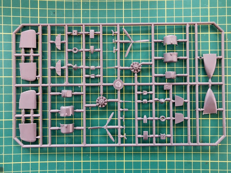 Na trzeciej wyprasce znajdziemy wszystkie potrzebne do budowy drobne elementy, z których największe to osłony silników, końcówki skrzydeł i śmigła. Wszystko to oczywiście wymaga pracy, oczyszczenia krawędzi, spasowania, czyli normalnych czynności przy budowie short runa. Co do silników, zastanowiłbym się nad wykorzystaniem jakiś żywicznych lub drukowanych zamienników. Jeśli oczywiście uda się trafić na takie lub też dopasować. Najpierw jednak trzeba się upewnić, ile będzie z nich widać, bo może nie warto.