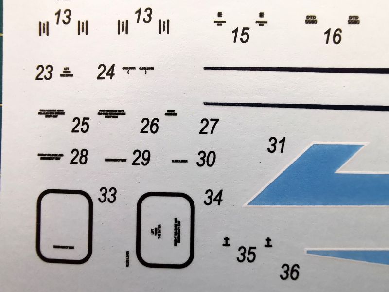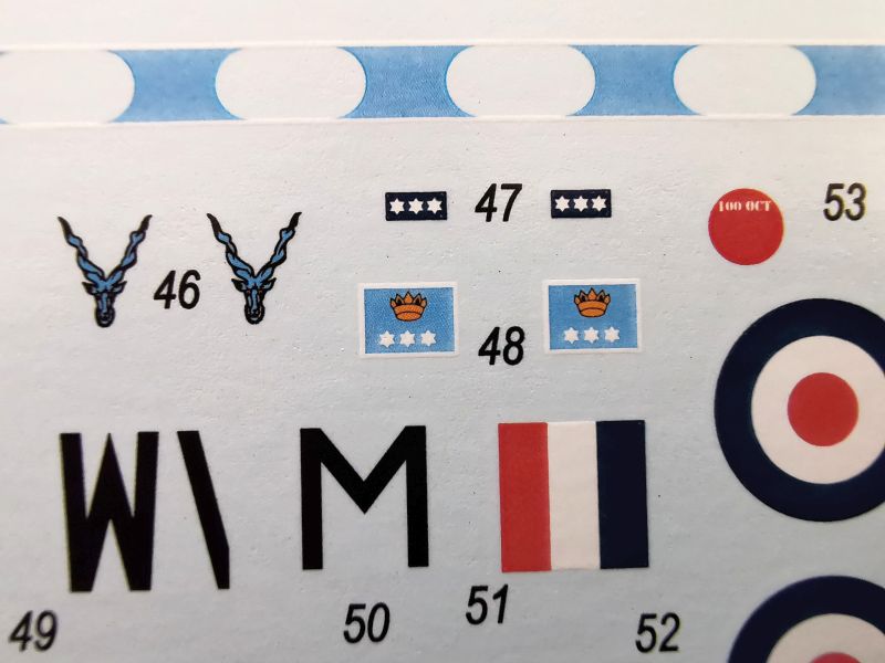 Kalkomania to dość spory arkusz, co wynika z wielkości samego modelu, jak i obecności dużych graficznych elementów w postaci pasów na kadłubie, godeł czy znaków rozpoznawczych i numerów. Do tego dochodzi całkiem pokaźna liczba stencili. Producent nie podaje, któte kalkomanie wydrukował, ale głównym podejrzanym jest tu Eduard.