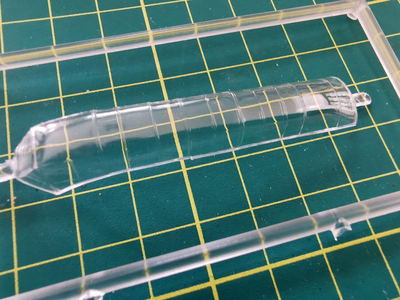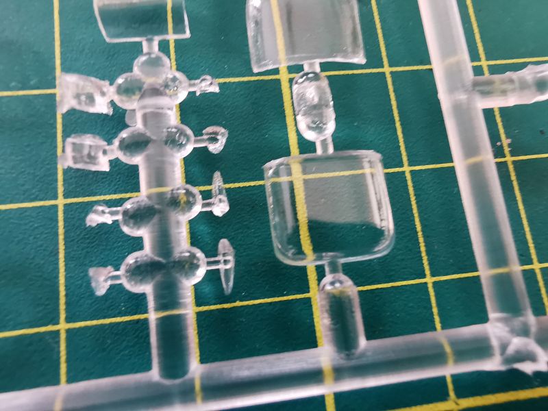 Oszklenie to znaczne mniejsza od powyżej pisanych podłużna wypraska na której większość miejsca zajmuje oszklenie kokpitu. Niestety jest to pojedynczy element, jeśli ładnie wyszło nam wnętrze i chcemy je wyeksponować, musimy osłonę podzielić na kilka elementów. Nie zabrakło też okienek na burtach kadłuba, kloszy reflektorów do lądowania i lamp pozycyjnych. Jakość wykonania, jak widać na zdjęciach, dla mnie bez zarzutu, ale pewnie znajdą się tacy co zdecydują się na przepolerowanie oszklenia. Co zresztą powinno wyjść mu jedynie na dobre.