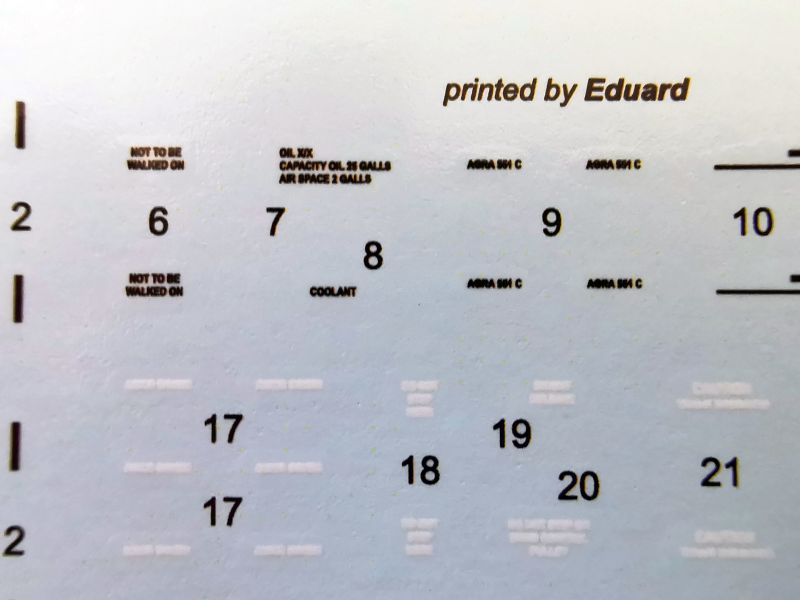 W zestawie nie ma blaszek, ani żywic, jest za to średniej wielkości arkusik z kalkomaniami. Na nim zaś brytyjskie oznaczenia, litery kodowe, jedno godło i dość duża ilość napisów eksploatacyjnych. Nie dopatrzyłem się błędów drukarskich w postaci na przykład nie prawidłowej kolorystyki czy przesunięć druku, ale nalazłem informację, że wydrukowała je firma Eduard. Jest to o tyle ważne, że po dokładnym wyschnięciu należy usunąć błonę z kalkomanii. Dopiero wtedy można myśleć jakiś waschach czy werniksie.