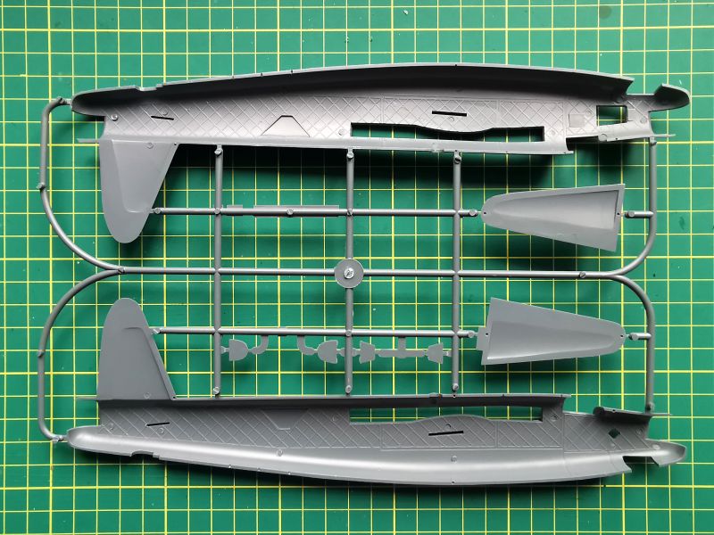 Zestaw składa się z pięciu wyprasek. Pierwsza z nich, „A” to połówki kadłuba oraz dolne części stateczników poziomych. Są też drobne detale silników, ale w tym zestawie ich nie wykorzystamy. Cechą charakterystyczną Wellingtona była oczywiście geodetyczna, kratownicowa konstrukcja płatowca, na której rozpinano poszycie wykonane z płótna. Porównałem uzyskany w zestawie efekt z tym, co można zobaczyć w modelach Airfixa i Trumpetera i doszedłem do wniosku, że Special Hobby znajduje się gdzieś po środku. Wygląda lepiej niż Trumpeter, ale jest mniej finezyjne niż Airfix. Niestety nie znaczono kratownicy w miejscach podłużnych okien po bokach kadłuba, pomimo, że całe wnętrze kadłuba ma taką kratownicę odtworzoną. Trzeba będzie to wykonać we własnym zakresie, bo przez okna jest ona doskonale widoczna. Producent nie przewidział możliwości otwarcia drzwi luków bombowych.