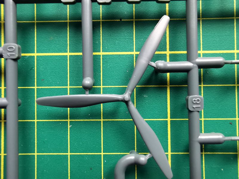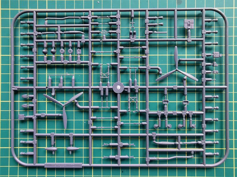 Kolejna wypraska to dalsza część wyposażenia, osłony silników, koła i tego typu rzeczy. Bardzo dobrze wypadają tu wnętrza luków podwozia (przy montażu należy pamiętać o zeszlifowaniu ich górnych krawędzi, o czym ostrzega instrukcja) i detale kokpitu. W modelu odtworzono ponadto nosowe i ogonowe stanowisko strzeleckie. Boczne stanowiska, ograniczają się jedynie do okien bocznych i karabinów, które na nich zamontujemy. Ta ostatnia uwaga dotyczy tylko jednego z proponowanych wariantów malowań. Jeżeli się na nie zdecydujemy, konieczne jest wycięcie w kadłubie otworów w kształcie trapezów.