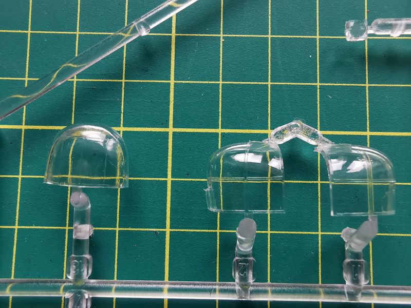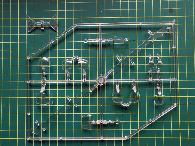 Oszklenie to aż dwie wypraski. Na większej znajdziemy jego podstawowe elementy, na mniejszej oszklenie bocznych stanowisk strzeleckich, o których już wspominałem. Jedyne zastrzeżenie jakie mam do oszklenia, to brak imitacji konstrukcji geodetycznej kadłuba w bocznych oknach. Żeby budowany przez nas model wyglądał poprawnie, musimy te elementy bezwzględnie odtworzyć. Była zresztą o tym mowa powyżej.