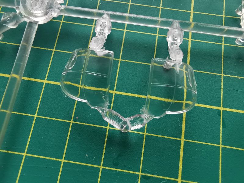Ostatnia wypraska zawiera przednie części gondoli silnikowych. Na nich zamontujemy silniki wraz z osłonami. Obydwa elementy mają na wewnętrznych stronach zaznaczone litery „L” i „R”, co powinno ułatwić nam prawidłowy ich montaż. Nie wiedzieć czemu, ta wypraska ma zupełnie odmienny kolor od pozostałych. Może to jest właśnie modyfikacja, o której wspominał producent?
