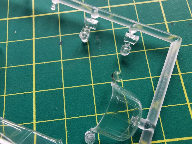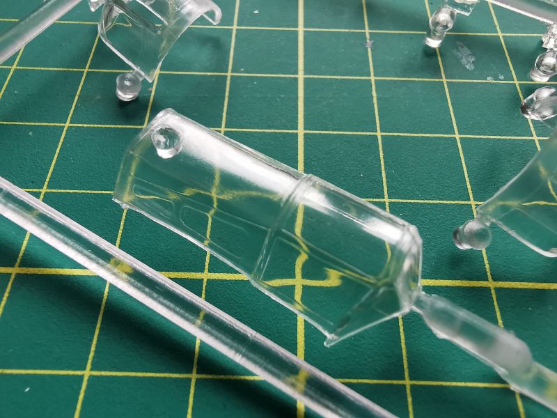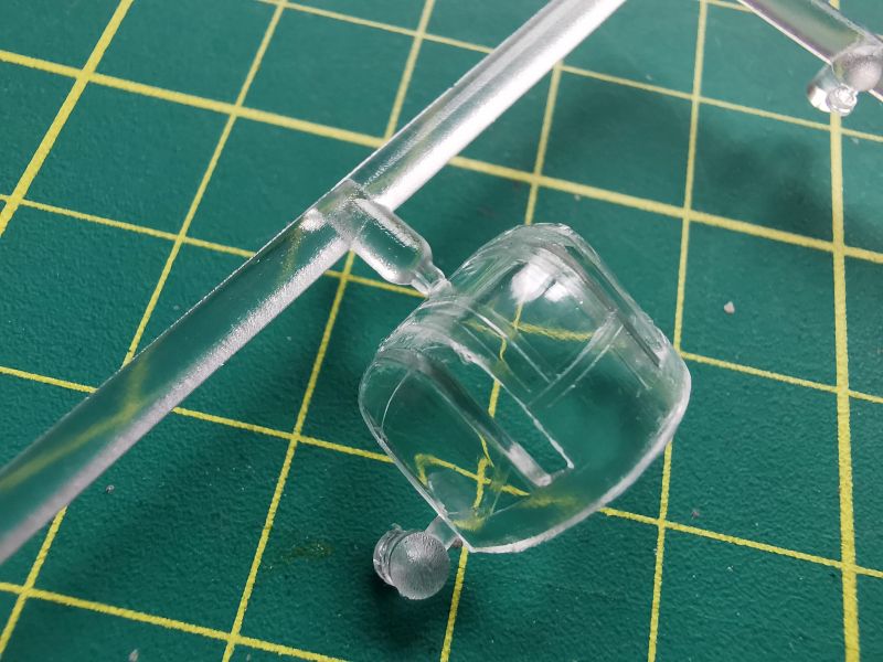 Zupełnie inna jest także wypraska zawierająca elementy przezroczyste. Z tych samych przyczyn co kadłub. Znajdziemy tu nie dzielona osłonę kabiny, składającą się z dwóch części wieżyczkę strzelecką oraz kilka drobnych elementów. Zarówno osłonie kabiny, jak i samej wieżyczce dobrze zrobi jakaś drobna polerka.