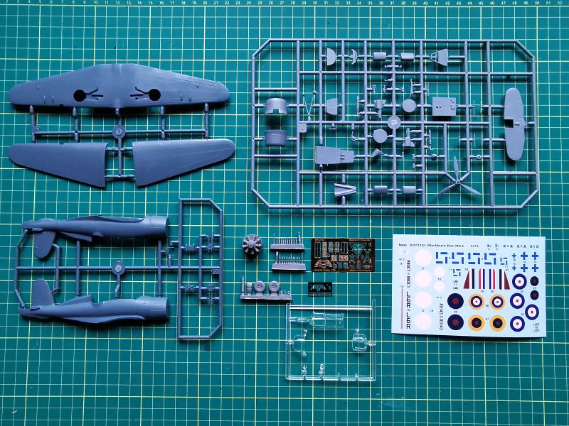 W skład zestawu wchodzą trzy wypraski z szarego plastiku, jedna przezroczysta, cztery odlewy z szarej żywicy, fototrawiona blaszka oraz klisza. Do tego całkiem pokaźny arkusz kalkomanii. Z modelem Skuy opisywany zestaw ma wspólną wypraskę ze skrzydłami oraz wypraskę z detalami. Identyczny jest też zestaw multimediów, czyli żywice, blaszka oraz klisza. Na tych dwóch ostatnich widnieje zresztą napis Skua oraz numer katalogowy tego modelu. Ponieważ jakiś czas temu opisywałem rzeczony zestaw, zapraszam do przeczytania jego recenzji: