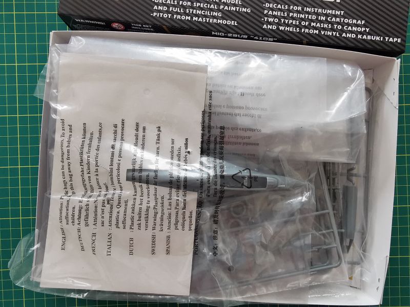 Prezentowany w tym miejscu zestaw został opracowany, właśnie przy przyjęciu takiej konwencji. Zapakowany w średniej wielkości pudełko z szatą graficzną dobrze znaną w wcześniejszego produktu czyli Su-22. Poza zdjęciem sklejonego modelu znajdziemy sporo informacji dotyczącej zawartości pudełka, łącznie z logotypami kooparantów. Jak zaznaczyłem powyżej tym razem firma ModelMaker zajęła się tematyką szkolno – bojowej odmiany MiGa-29. Dokładniej, jest to samolot z 22-giej bazy Lotnictwa Taktycznego w Malborku noszący okolicznościowe malowanie, upamiętniające czołowego polskiego asa myśliwskiego z okresu II wojny światowej, Stanisława Skalskiego. Generał Skalski jest jednocześnie patronem malborskiej bazy. Po otwarciu pudełka naszym oczom ukazują się foliowe torebki z wypraskami wykonanymi z jasno szarego polistyrenu, które wyglądają dosyć znajomo.