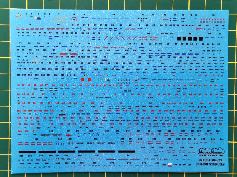 Także kolejny arkusz kalkomanii to produkt z oferty kalkomanii ModelMakera. Dokładnie D72091, MiG-29 Polish Stencils. Czyli nic innego, jak napisy eksploatacyjne stosowane w polskich MiGach-29. Średniej wielkości arkusik, na których znajduje się dobrze ponad setka oznaczeń, drobnych, drobniutkich i szalenie drobnych, ale niektóre nawet da się odczytać. Z własnego doświadczenia wiem, że oklejenie modelu wszystkimi kalkomaniami znajdującymi się na arkuszu może zając i kilka dni, ale warto się pomęczyć. Właśnie stencile i podwieszenia robią robotę w modelach współczesnych odrzutowców.