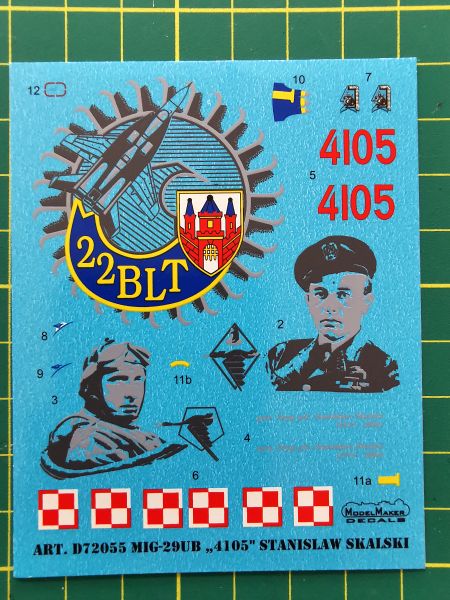 Ponieważ kalkomanie umożliwiające wykonanie modelu MiGa-29 UB w malowaniu poświęconym Stanisławowi Skalskiemu od pewnego czasu wchodzą w skład oferty firmy ModelMaker, nie trudno się było domyślać, że wejdą one w skład tego zestawu. Jako osobny produkt mają one numer katalogowy D72055, zaś znajdziemy na nich szachownice, numery, godła oraz co najważniejsze – emblematy okolicznościowe znajdujące się na usterzeniu i grzbiecie kadłuba. W tym miejscu trzeba zwrócić uwagę na elementy oznaczone jako 10, 11a i 11b. W schemacie malowania nie ma informacji, w jaki sposób należy je użyć. Są one uzupełnieniem godła na grzbiet kadłuba, w miejscu gdzie znajduje się chwyt powietrza do jednego z układów samolotu. Jest to element G7. Aby nakleić te kalkomanie prawidłowo, warto odwiedzić stronę producenta i zajrzeć do instrukcji zestawu D72055, tam jest to pokazane, a tu, jak widać zadziałały prawa Murphiego. Dlatego zachęcam do odwiedzenia strony.