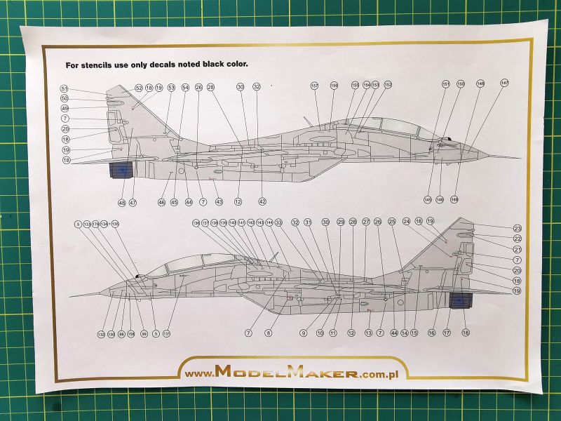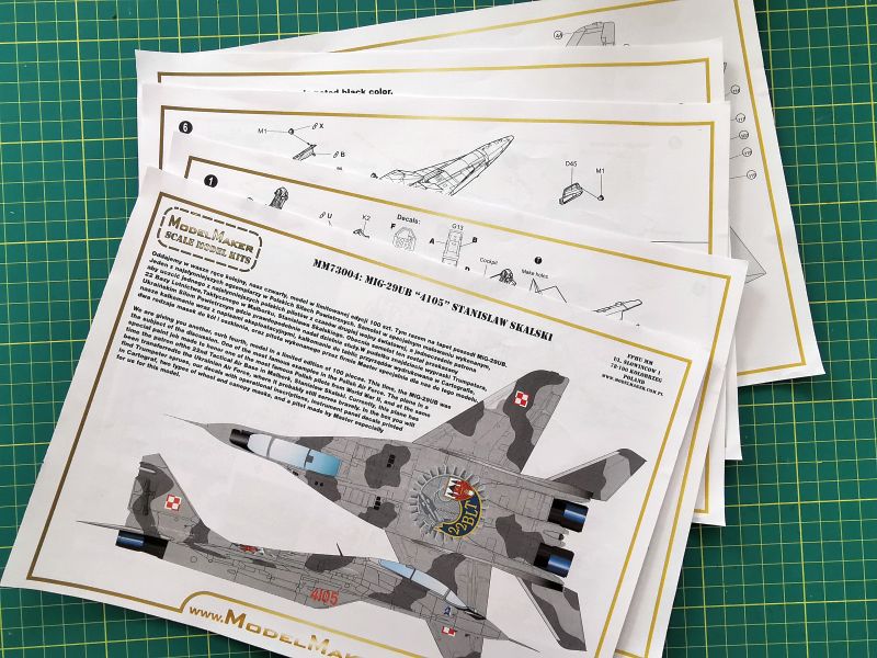 Instrukcja montażu i malowania została opracowana w sposób analogony, jak zestawy kalkomanii oferowane przez kołobrzeskiego producenta. Są to kolorowe wydruki w formacie A4. Na stronie tytułowej znajdziemy notatkę z której możemy dowiedzieć się nieco o samym samolocie, jak i o zestawie. Jej treść zredagowano po polsku i po angielsku. Rysunki montażowe pochodzą w oryginalnego zestawu Trumpetera, na nowo, z uwzględnieniem zmian opracowano jedynie rozpiskę wartości pudełka. Na ostatnich stronach instrukcji znajdują się oczywiście schematy malowania i nałożenia kalkomanii. Przy czym ogólny schemat liczy dwie strony, schemat nakładania stencili aż sześć, z czego jedna to napisy na belki oraz podwieszenia. Te ostatnie to podkadłubowy zbiornik paliwa, oraz szkolne kierowane pociski rakietowe UZR-60. Czy ten akurat MiG-29 UB przenosił także inne uzbrojenie, tego nie wiem, trzeba po prostu poszukać zdjęć lub informacji na ten temat.