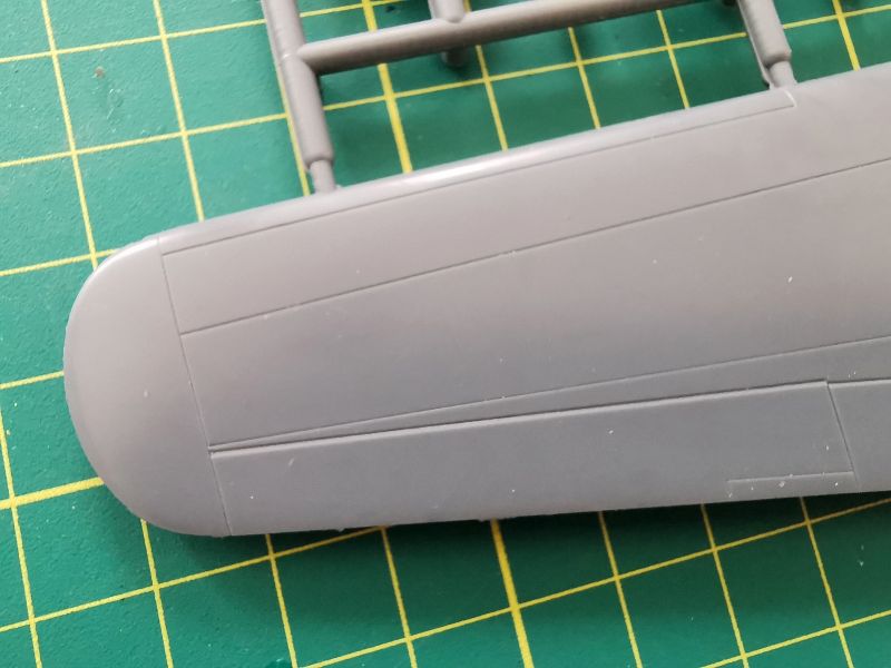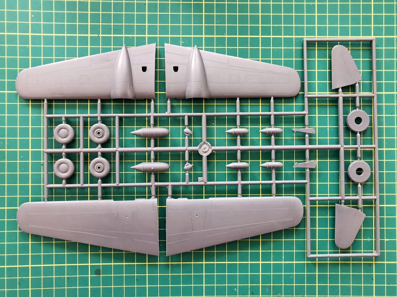 Podstawę zestawu tworzą trzy dość spore wypraski wykonane z szarego tworzywa. Czy formy przeszły jakąś regenerację, tego nie wiem, ale wypraski nie wyglądają źle. Ogólnie czysto, a nadlewki występują w minimalnych ilościach i są łatwe do usunięcia. Pierwsza z wyprasek zawiera połówki kadłuba, gondole silnikowe, śmigła z kołpakami oraz trochę drobnych detali. Wszystkie powierzchnie zewnętrzne mają delikatne ale wyraźne linie podziału blach, w niektórych miejscach są także nity. Nie ma natomiast kołków pozycjonujących wzajemnie połówki kadłuba. Skrzydła i usterzenie pionowe przyklejamy na styk.