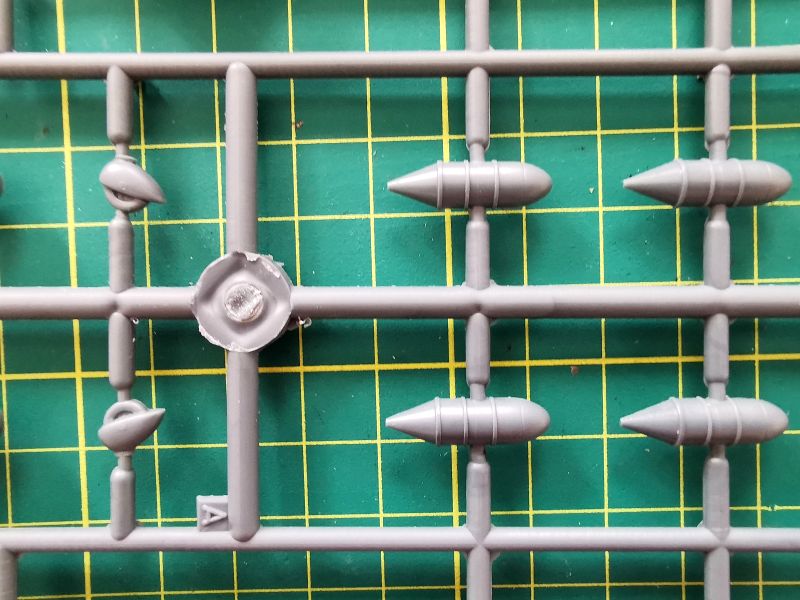 Kolejna wypraska to skrzydła, usterzenie poziome, koła, korpusy bomb. Oczywiście trochę drobiazgów też się znajdzie. Także w tym wypadku nie mam zastrzeżeń, co do jakości wykonania poszczególnych elementów. Ograniczę się tylko do stwierdzenia, że wszystkie powierzchnie sterowe to integralne elementy skrzydeł i usterzenia, zaś imitacje pokryć płóciennych wykonano w sposób poprawny i bardzo subtelny.