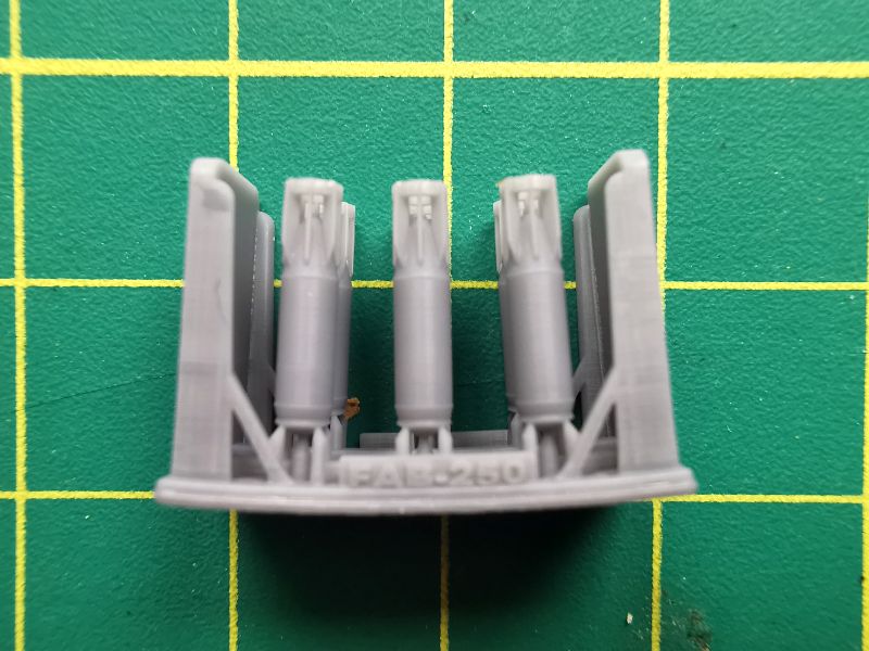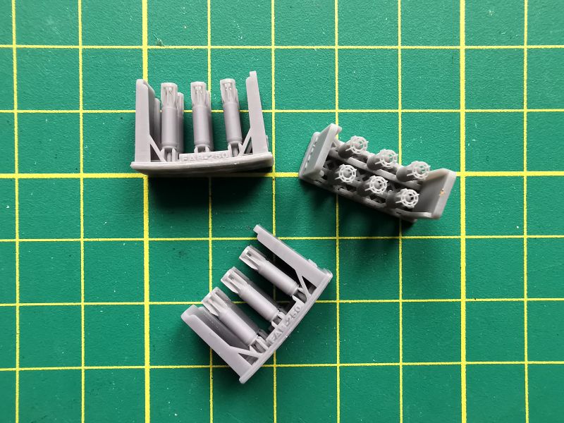 Uzupełnieniem elementów wykonanych z polistyrenu jest fototrawiona blaszka oraz wydruki 3D. Jedynie wyloty dysz silników są identyczne jak w poprzedniej wersji. Tutaj fototrawioną blaszkę opracowano na nowo z uwzględnieniem wszystkich drobnych detali jakimi różniły się obie wersje Tu-22M. Bardzo dobrym pomysłem było natomiast wykonanie bomb FAB-250 w formie wydruków 3D. Do zestawu dołączono trzy wydruki, zaś na każdym znajduje się po sześć gotowych do dalszej pracy bomb. Odpada żmudne przyklejanie do każdej bomby fototrawionych stabilizatorów. Tym bardziej, że ten właśnie wariant uzbrojenia z bombami na belkach wielozamkowych jest równie atrakcyjne, jak te z pociskami manewrującymi.