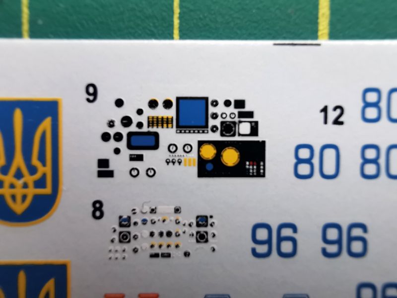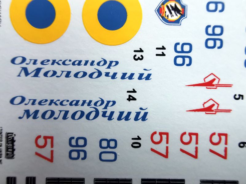 W omawianym zestawie, podobnie jak w przypadku modelu Tu-22M3, kalkomania także składa się dwóch arkusików. Mniejszego, na którym znajdziemy panele do naklejenia na grzebiecie kadłuba. Pominąłem go jednak, bo jest identyczny, jak w poprzedniej wersji. Większy arkusik przygotowano już na potrzeby tego zestawu. Zawiera on oznaczenia, godła ale także wyposażenie kokpitu i kratki do umieszczenia na wlotach powietrza. Jakość wykonania kalkomanii jest identyczna, jak poprzednich modelach tego producenta, czyli bardzo dobra. Nie jest to czcza propaganda, pracowałem z tymi kalkami przy klejeniu modelu J-22 ORAO.