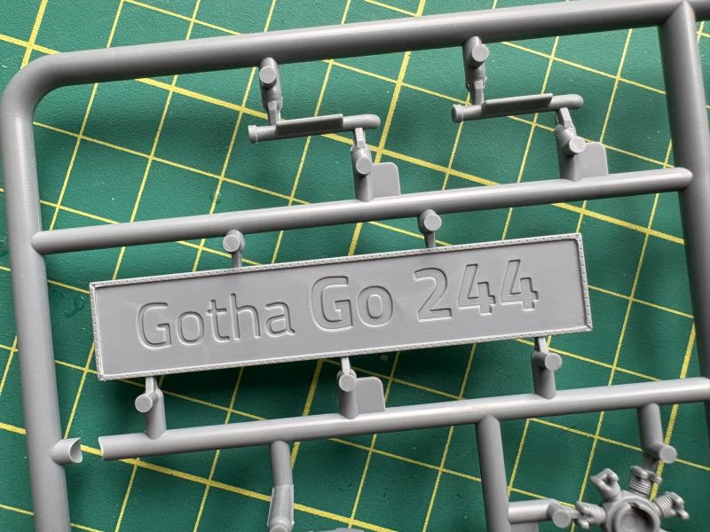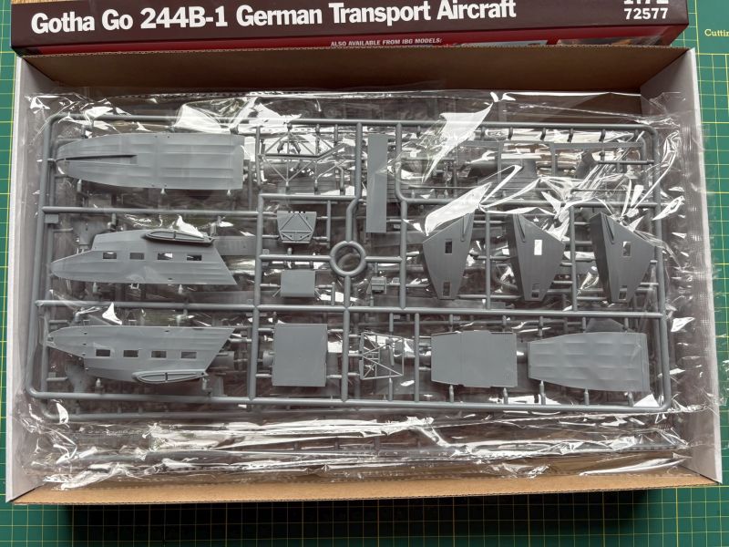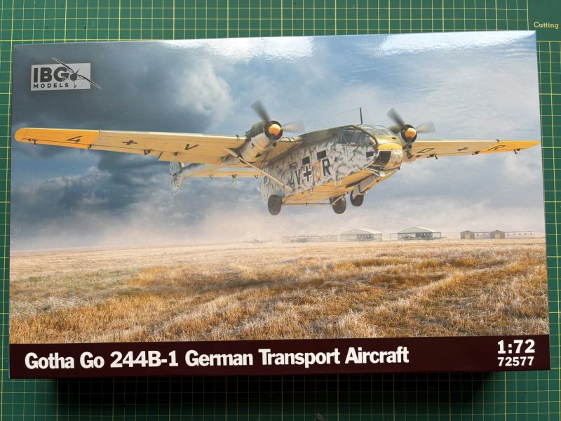 Zacznę od modelu samolotu transportowego Gotha Go 244B-1. Podobnie jak rzeczywisty pierwowzór ewoluował z szybowca transportowego, tak model ewoluował z wydanego nie tak dawno modelu szybowca transportowego. Pojawienie się tego zestawu na rynku było anonsowane już przy pierwszych zapowiedziach całej rodziny modeli szybowców i samolotów transportowych bazujących na konstrukcji Go-242. W stosunku do tego zestawu wspólna jest większość ramek wtryskowych, ramka z oszkleniem oraz fototrawiona blaszka.