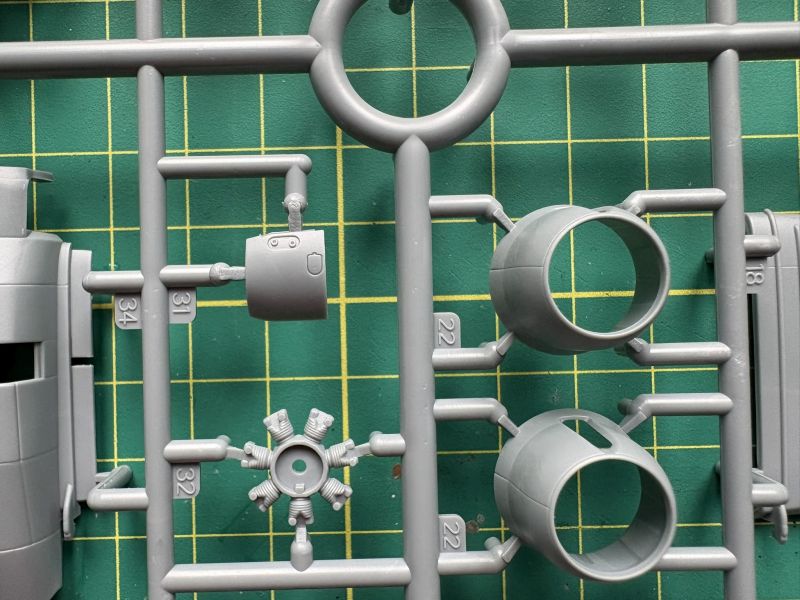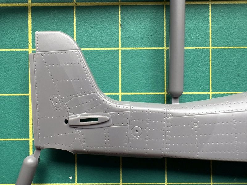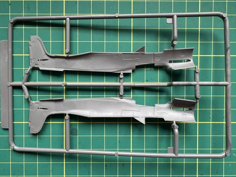 Różnice w stosunku do poprzednich zestawów są oczywiste, bo ograniczają się do innego kształtu statecznika pionowego. W tym celu w opisywanym zestawie znajdziemy wypraskę oznaczoną jako „F”. Rozmieszczono na niej na nowo opracowane połówki kadłuba z szerokim statecznikiem, do którego po sklejeniu kadłuba dokleimy standardowy ster kierunku. Pozostałe wypraski zestawu wchodziły w skład poprzednio wydanych modeli niemieckiego myśliwca. Podobnie ma się sprawa blaszki fototrawionej i kalkomanii z napisami eksploatacyjnymi.