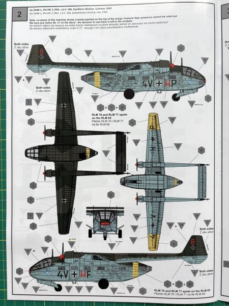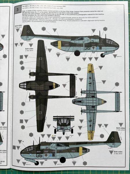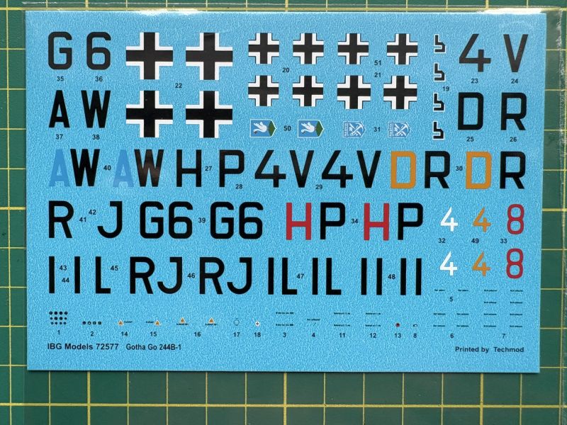 Kalkomania to dość spory arkusz, co jest normą przy modelach takich jak Gotha. Dość spore wymiary modelu oraz ilość wariantów malowania determinują dość słuszne wymiary arkusika kalkomanii. Poza oznaczeniami, godłami i stencilami znajdziemy tu także tarcze zegarów na tablice przyrządów.