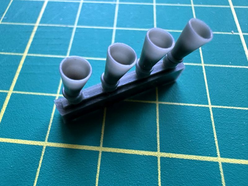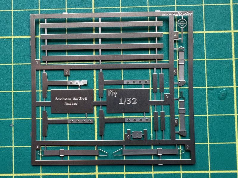 O zastosowanej technologii przypominają także dołączone do zestawu dodatki w postaci fototrawionej blaszki oraz kilku odlewów wykonanych z ciemnoszarej żywicy. Na blaszce znajdziemy pasy pilota, celownik, mocowanie silników startowych a także całkiem ładne tabliczki z nazwą modelu i skalą. W formie odlewów żywicznych wykonano natomiast wyrzutnię rakiet, dysze wszystkich silników oraz sporo drobiazgów, które zastosujemy zarówno w kokpicie jak i na zewnątrz.
